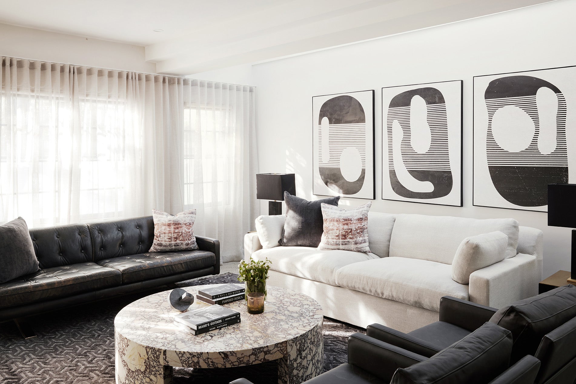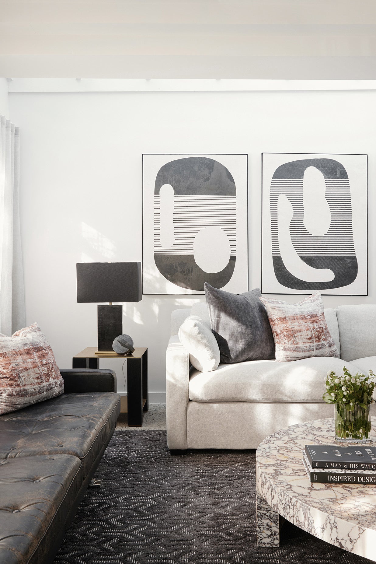 The modern studio scheme at Balmain House, designed by Lily Cumberland, embraces a sophisticated monochrome aesthetic. Tappeti’s ORA Arrow Charcoal rug integrates seamlessly into this palette, making a bold graphic statement that anchors the space with its unique geometric repeat and focused energy.