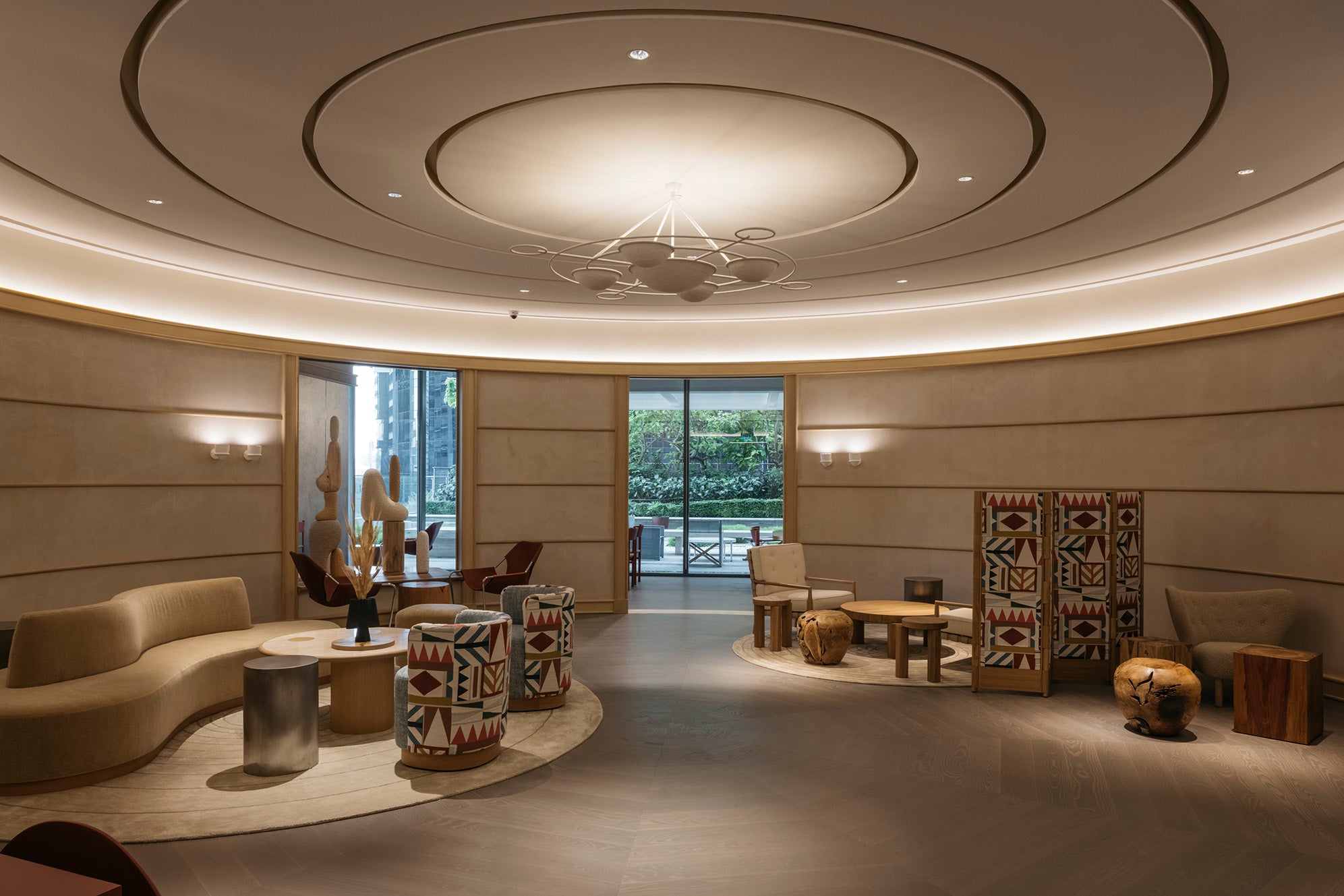 Central to this innovative design is Tappeti’s custom ‘Luxe and Felt Concentric’ rug. This hand-tufted masterpiece showcases a harmonious blend of loop and cut pile, meticulously crafted from felted wool combined with wool and art-silk. Its unique concentric motion design reflects Tappeti's commitment to creating visually engaging and texturally rich floor art, providing a sophisticated focal point for the space.