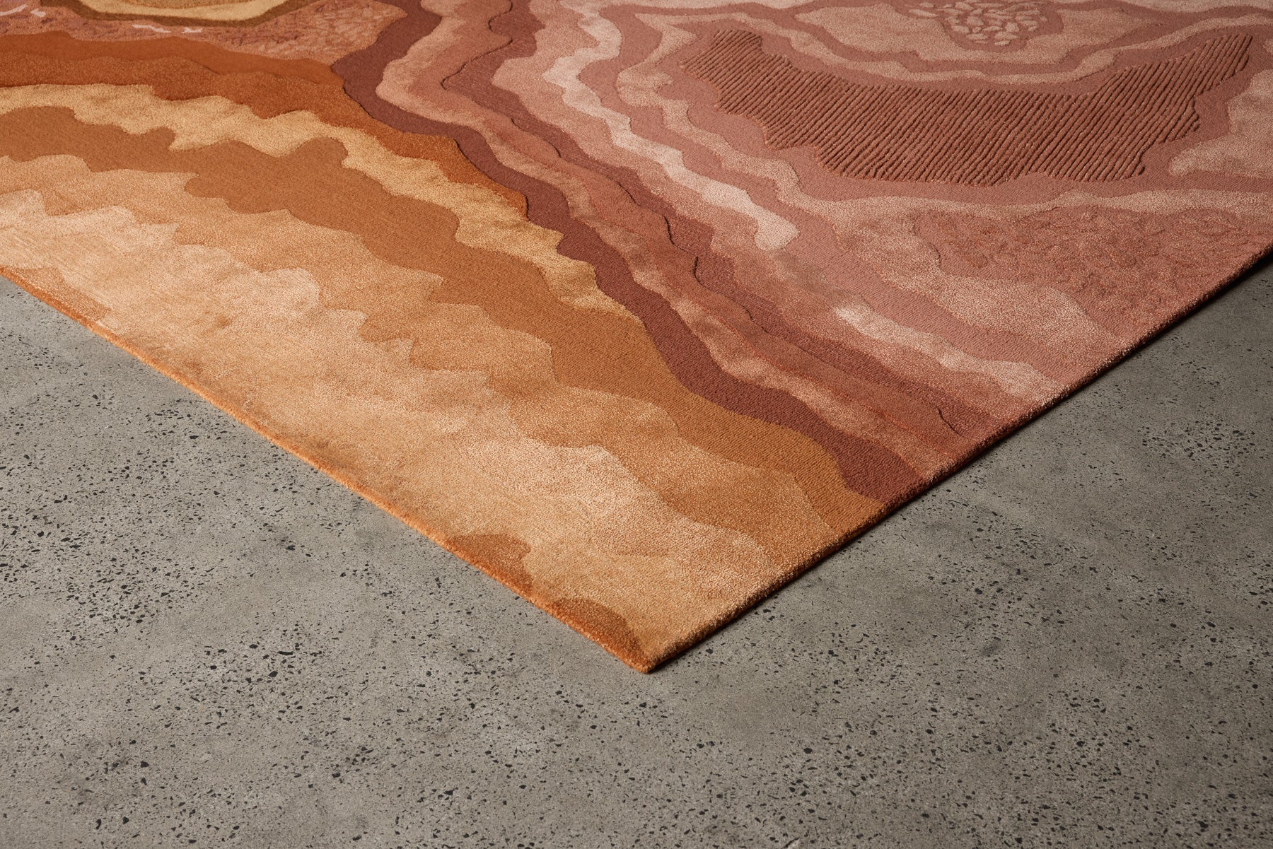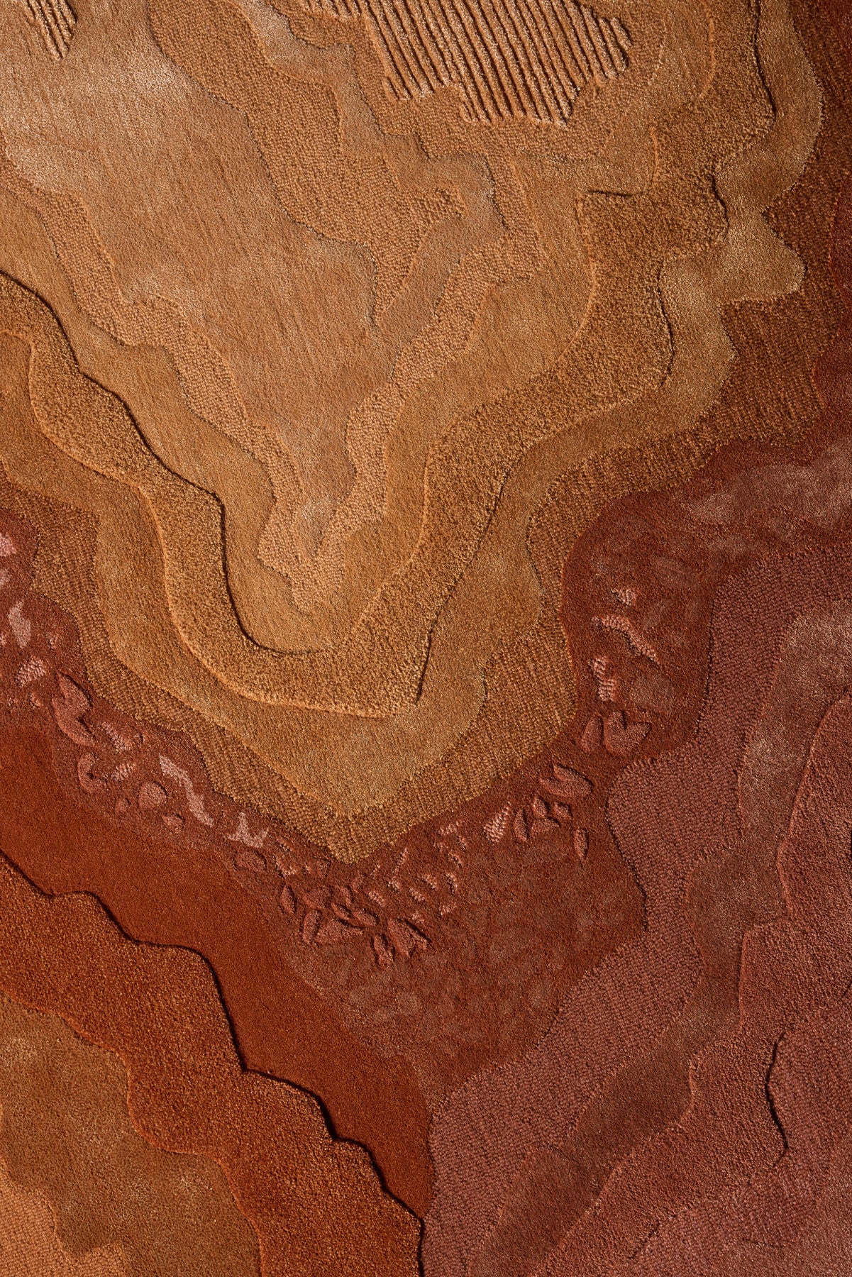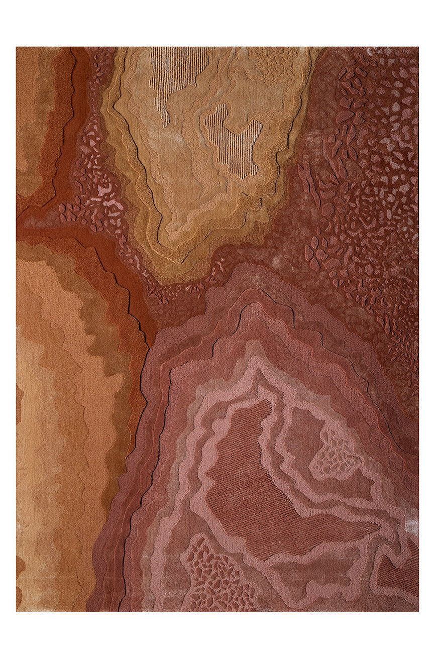 Aqualis Rust presents an intricate interplay of organic forms and rich, fiery textures. Its surface unveils undulating layers rendered in a sophisticated palette of deep terracottas, burnished oranges, and striking reds, evoking the raw grandeur of geological wonders. The design features precise, etched details and a dynamic interplay of pile heights, including 12mm finished cut pile, 12mm finished loop pile, and 15mm raised cut pile, creating a tactile topography that invites exploration and mirrors its visual depth. Meticulously hand-tufted from a luxurious blend of New Zealand wool with luminous art-silk, Aqualis Rust offers both exceptional beauty and enduring quality.