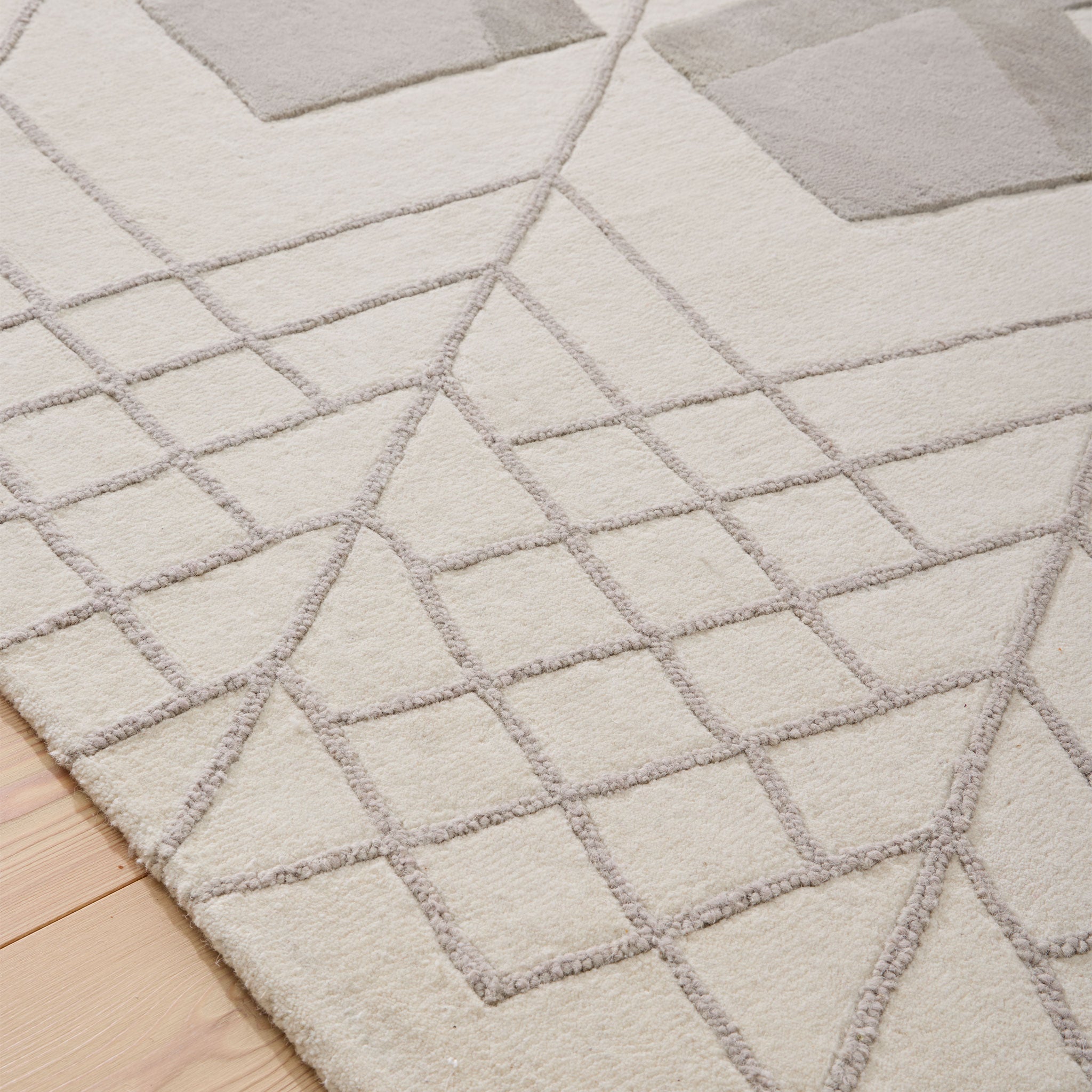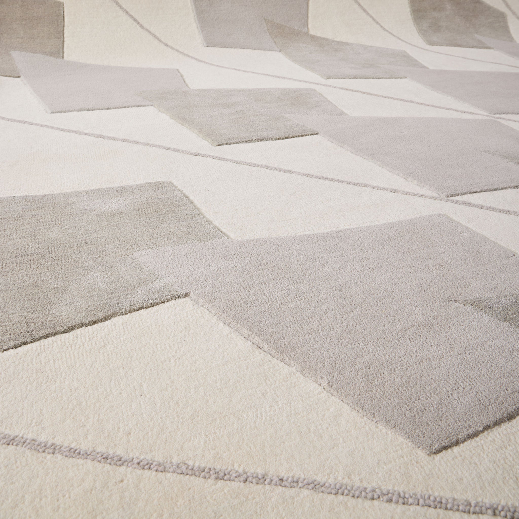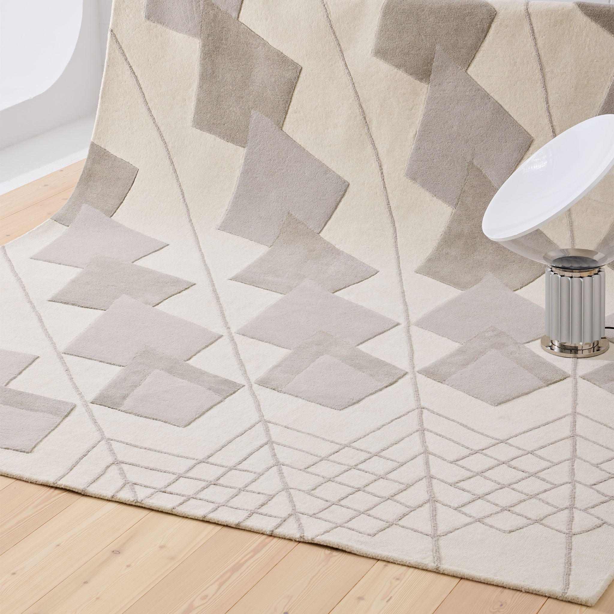 Behold the Bennelong rug from Tappeti, a handcrafted homage to the iconic Sydney Opera House, a jewel of Sydney, Australia. A geometric interlaced design unfolds in a sophisticated grey and ivory color palette, meticulously brought to life in pure New Zealand wool. Varying cut pile heights dance across the surface, intersected by lines of loop pile, while diamond tiles are precisely defined with carved details, all achieved through the artistry of hand-tufting to create a modern rug of architectural grace.
