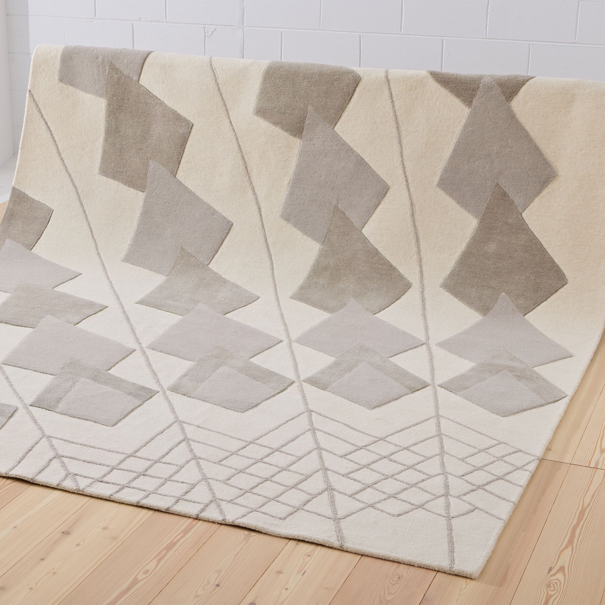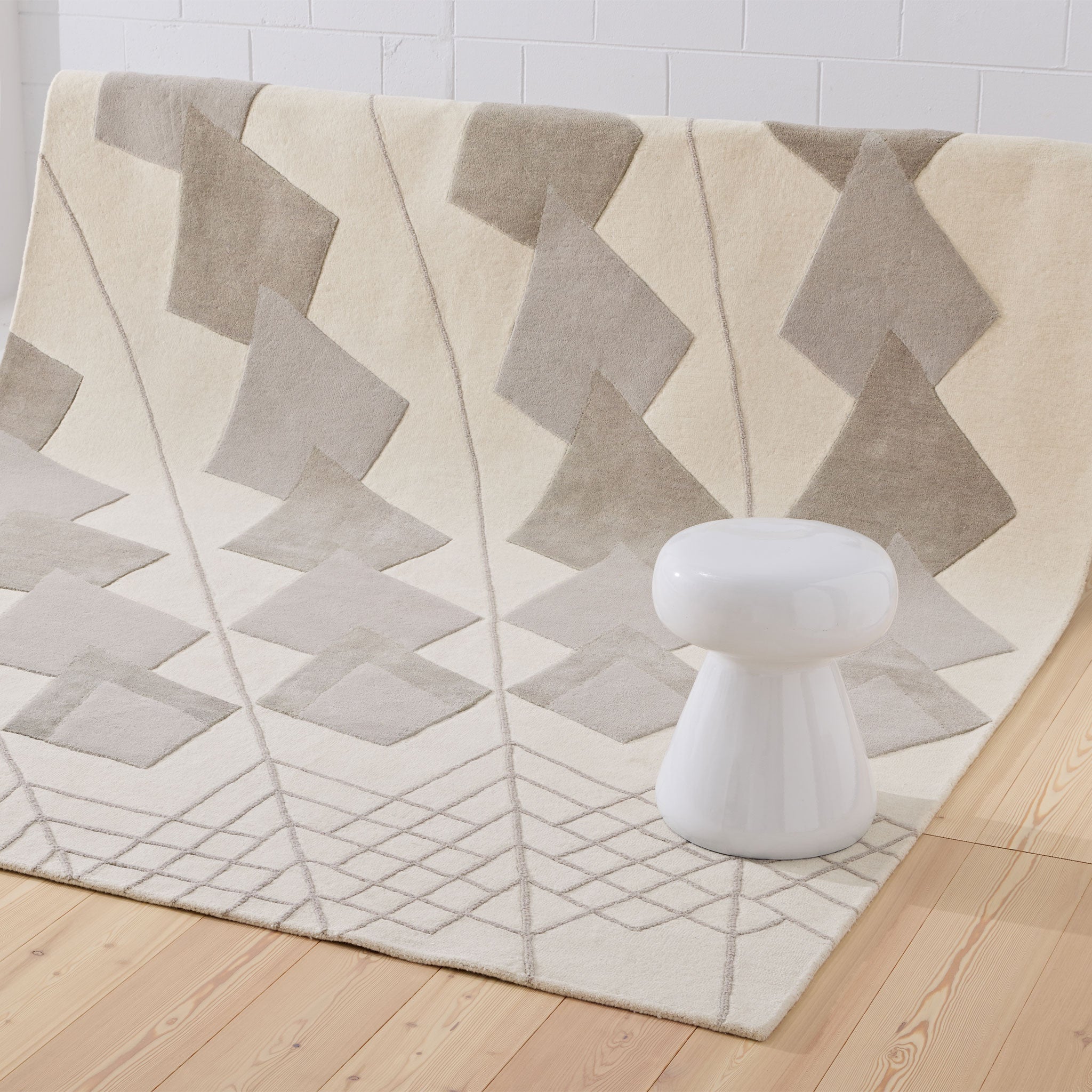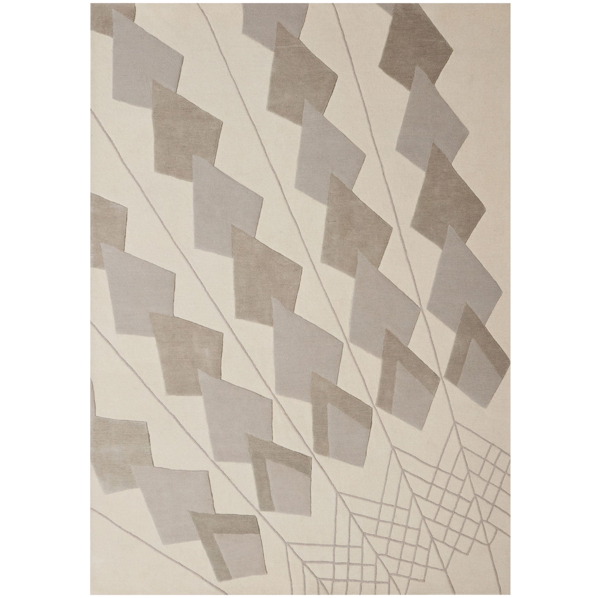 Behold the Bennelong rug from Tappeti, a handcrafted homage to the iconic Sydney Opera House, a jewel of Sydney, Australia. A geometric interlaced design unfolds in a sophisticated grey and ivory color palette, meticulously brought to life in pure New Zealand wool. Varying cut pile heights dance across the surface, intersected by lines of loop pile, while diamond tiles are precisely defined with carved details, all achieved through the artistry of hand-tufting to create a modern rug of architectural grace.