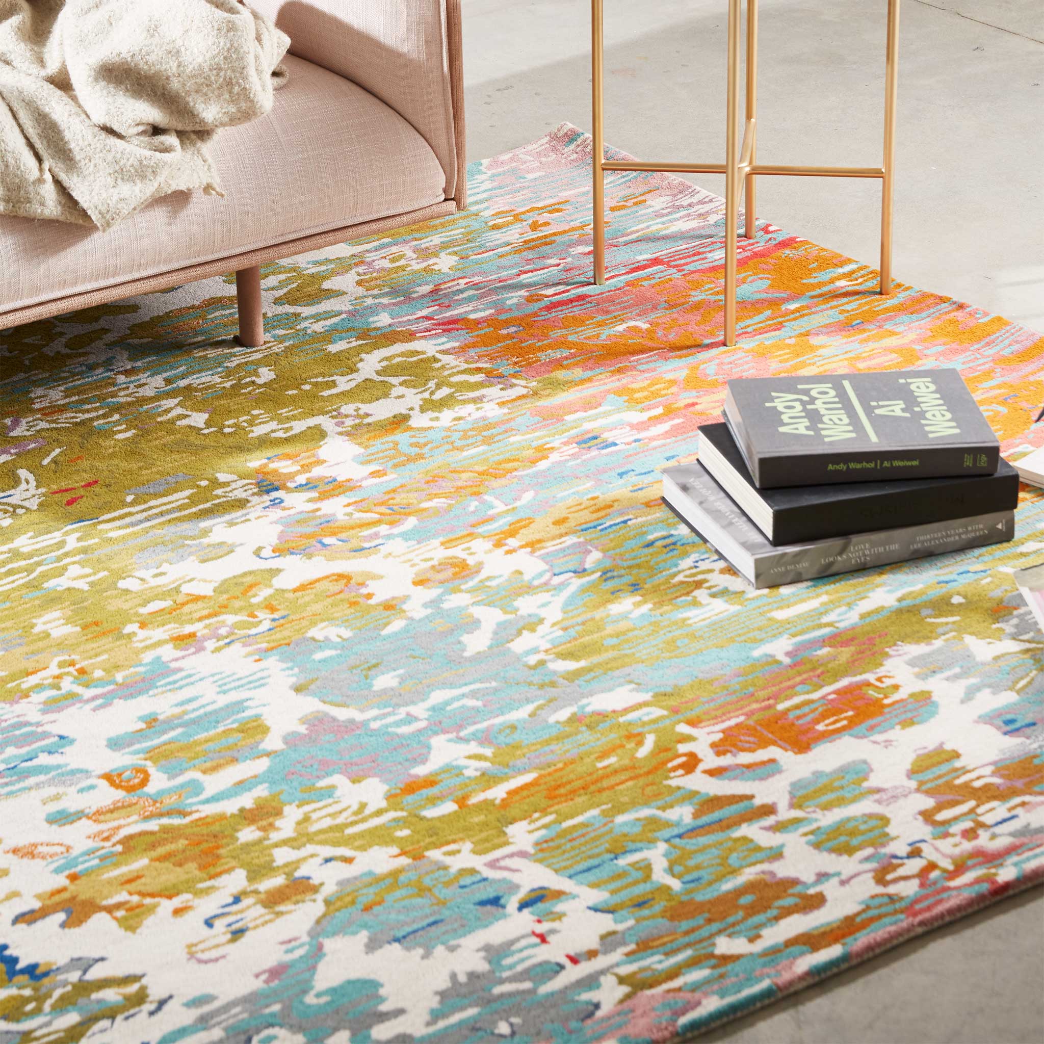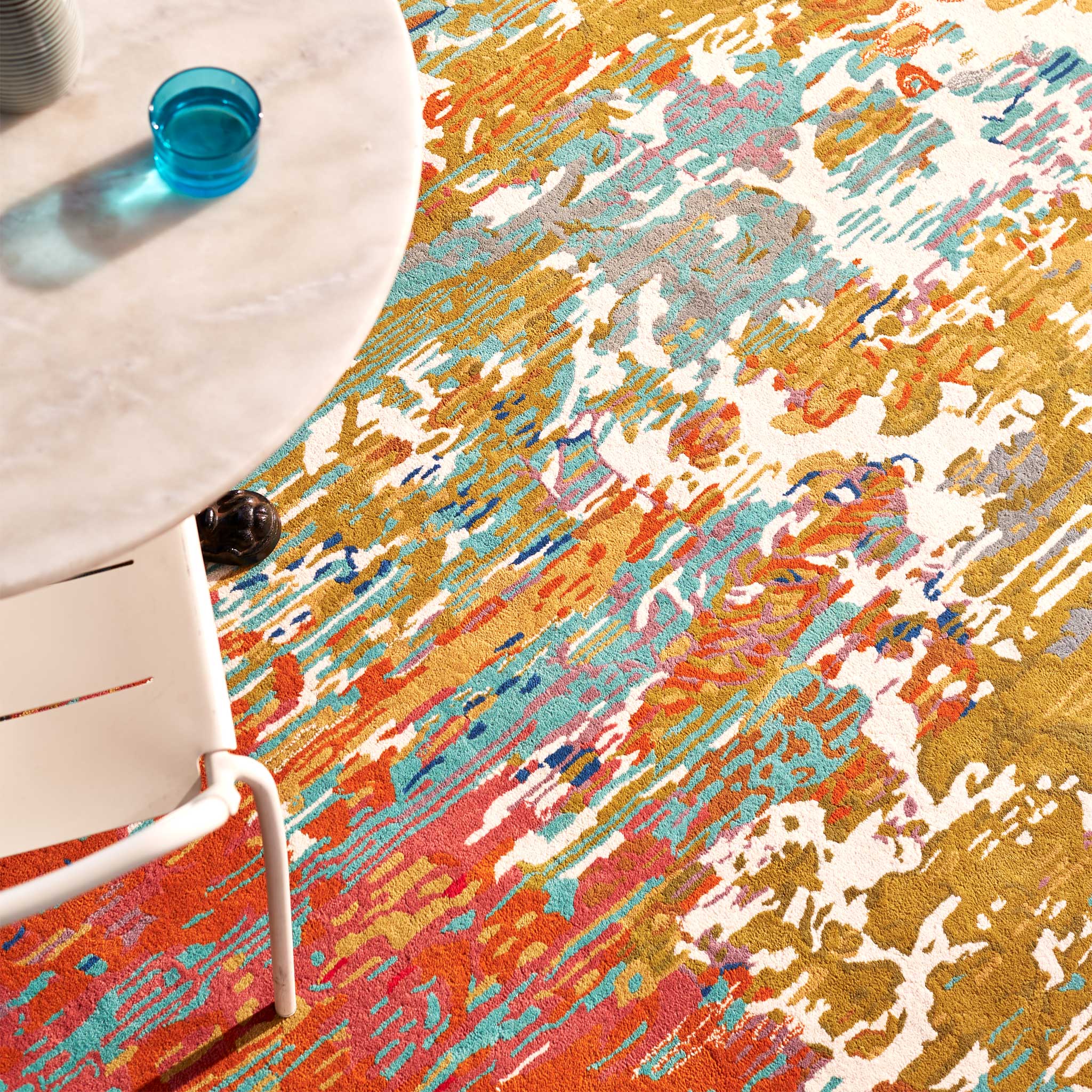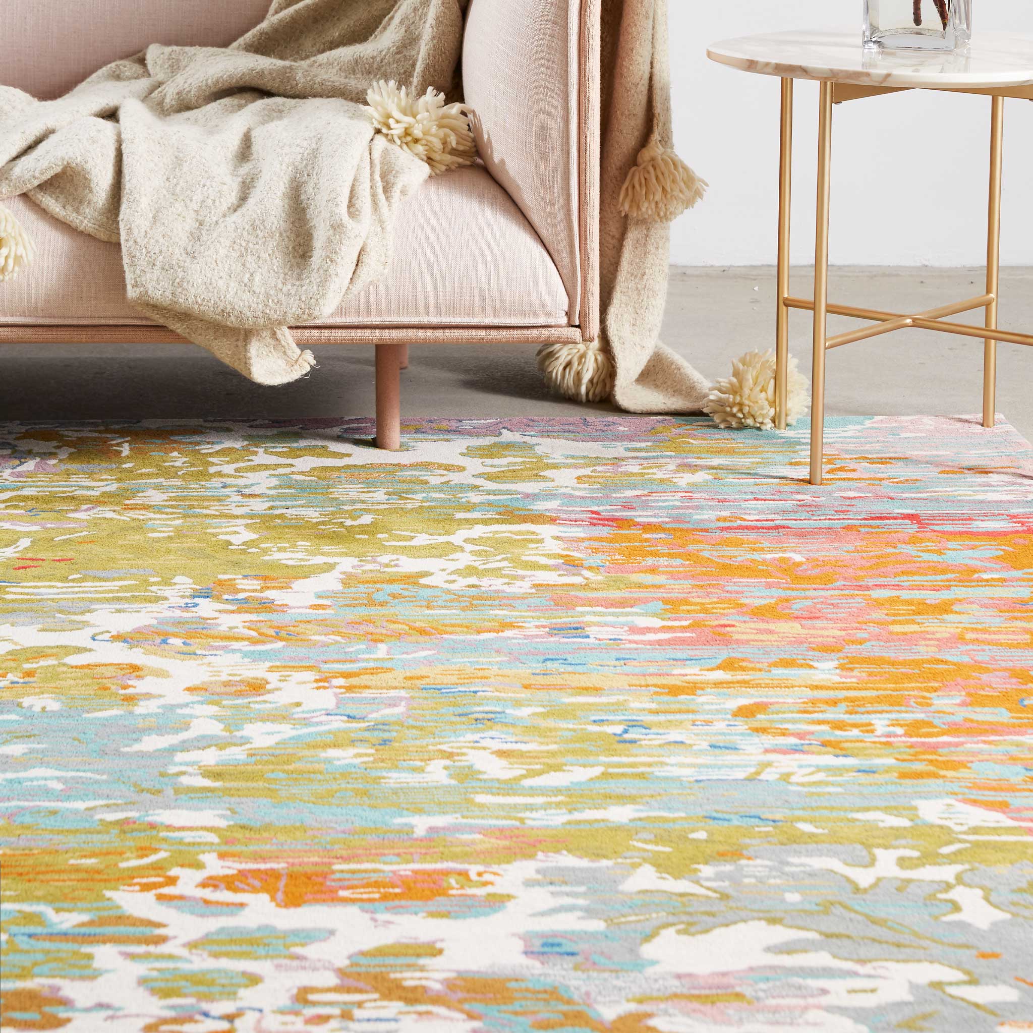 “With this rug I wanted to design something more abstract and textural and play with light and shadows. It’s a digital collage of layer upon layer of some of “my favourite things“, wild foliage, broken surfaces, rough concrete, peeling paint, fading light, blurred shadows and smudges. ” – Kerrie Brown