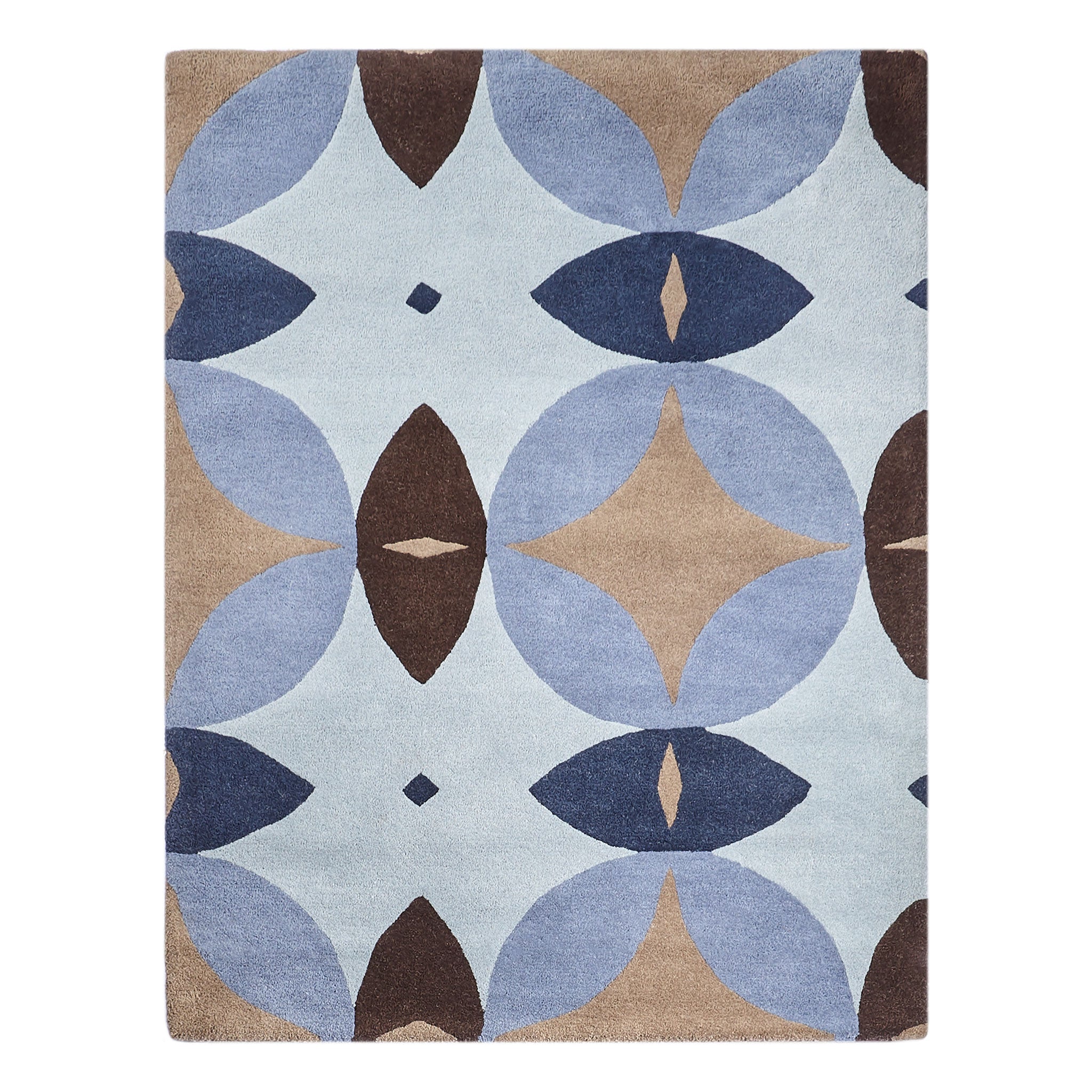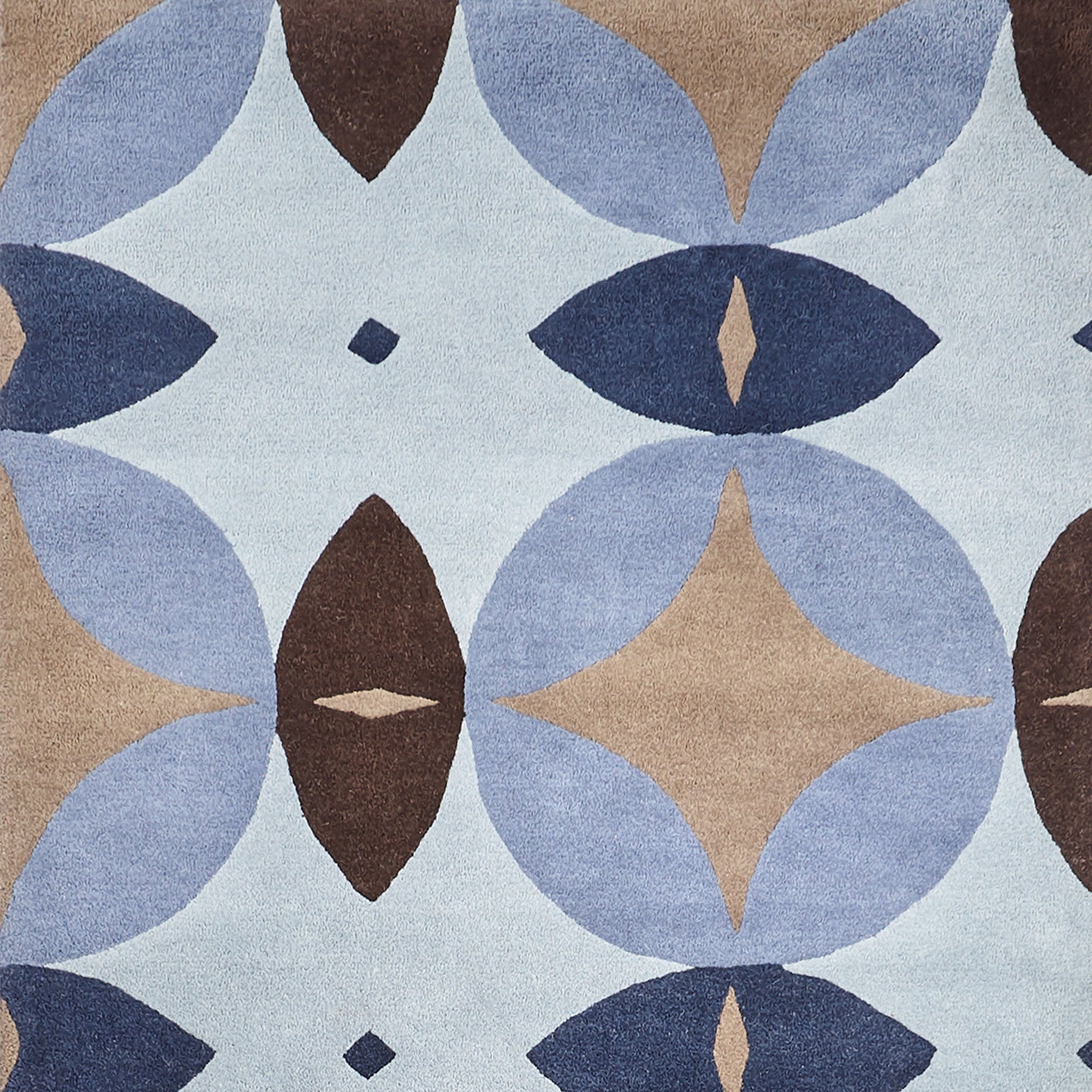 A repeated geometric in hues of blue with highlights of chocolate and beige.