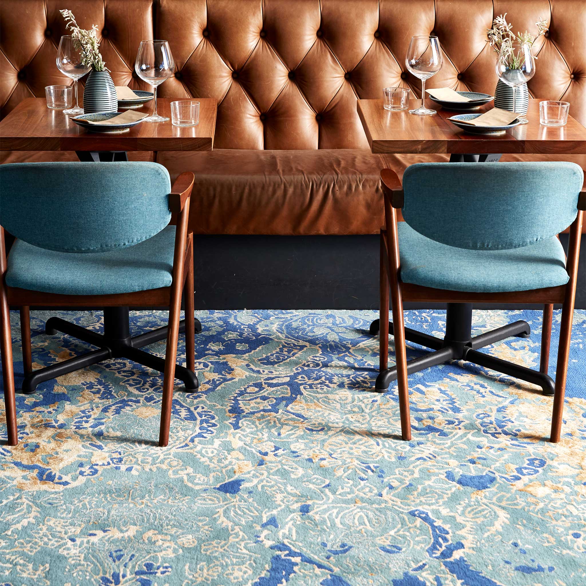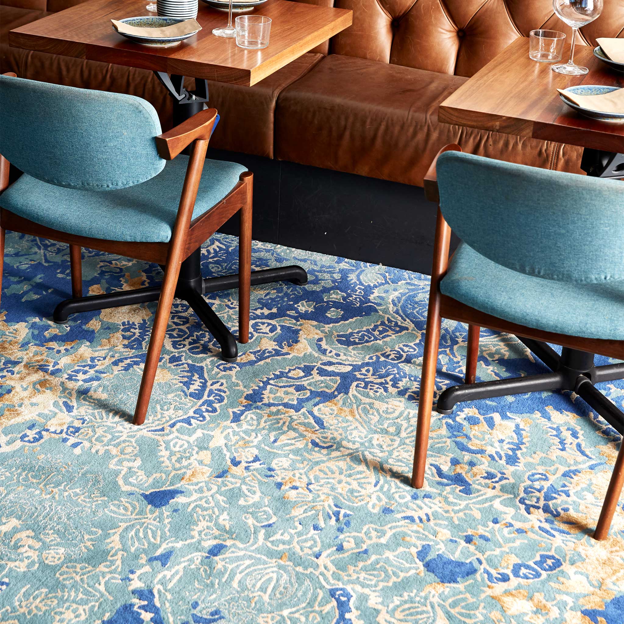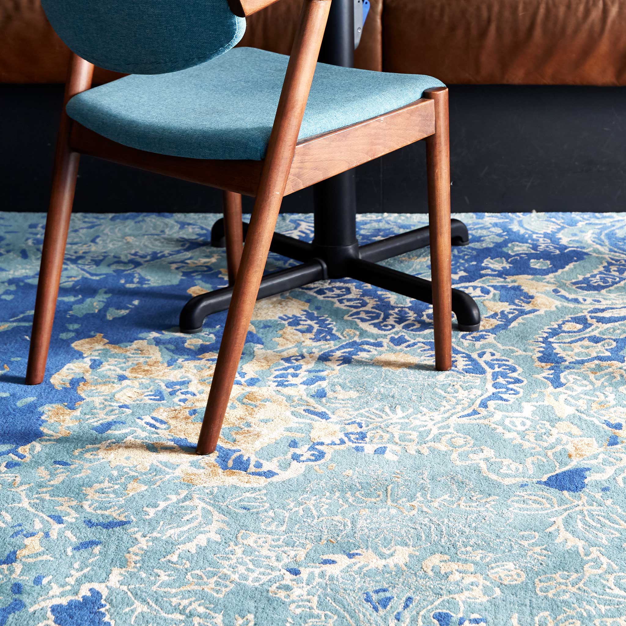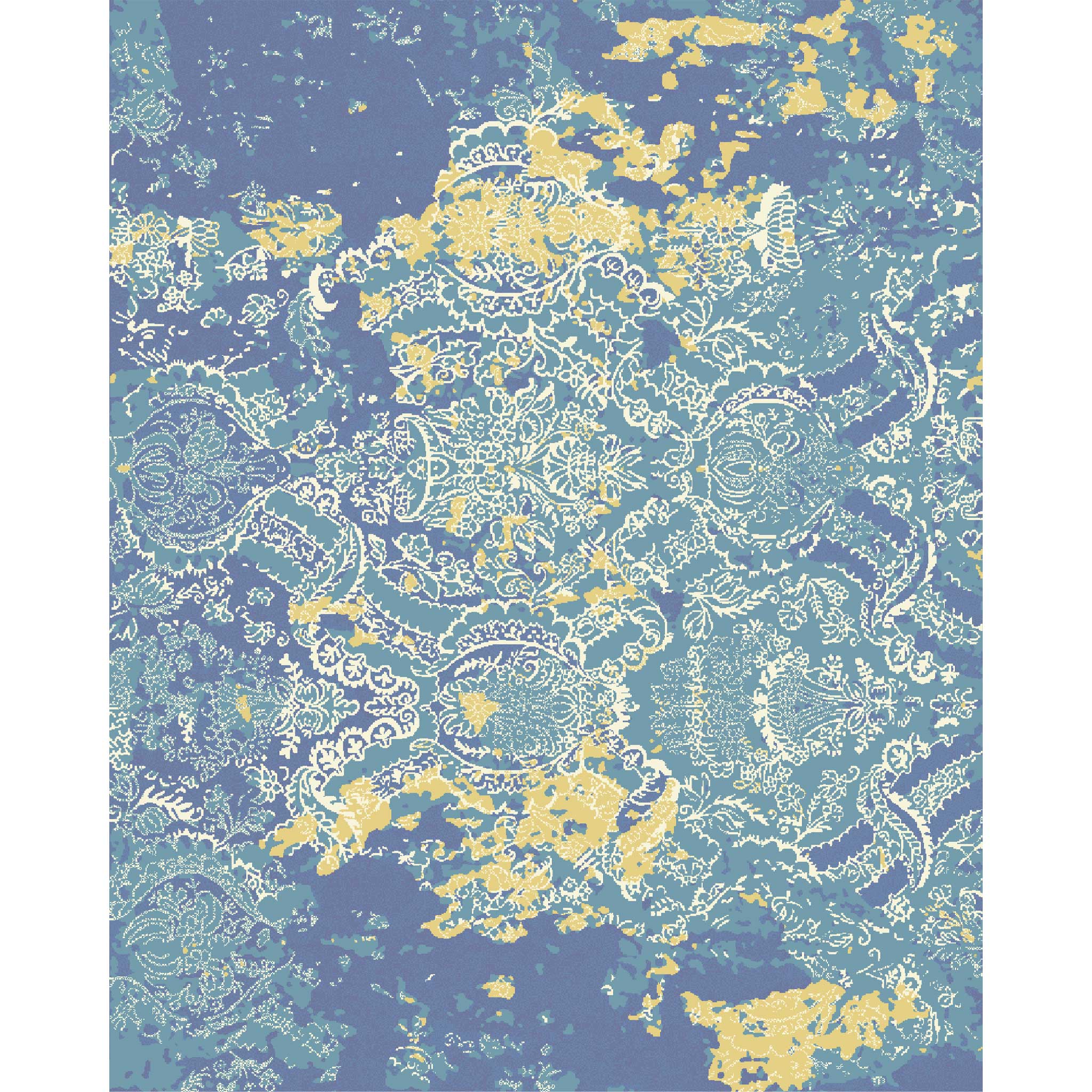 “Is a play on an early 19th century traditional paisley pattern. The scale is enlarged and overlaid with cracks and smudges of dark blue pigment to seemingly tell the story of a well worn and much loved rug. – Kerrie Brown