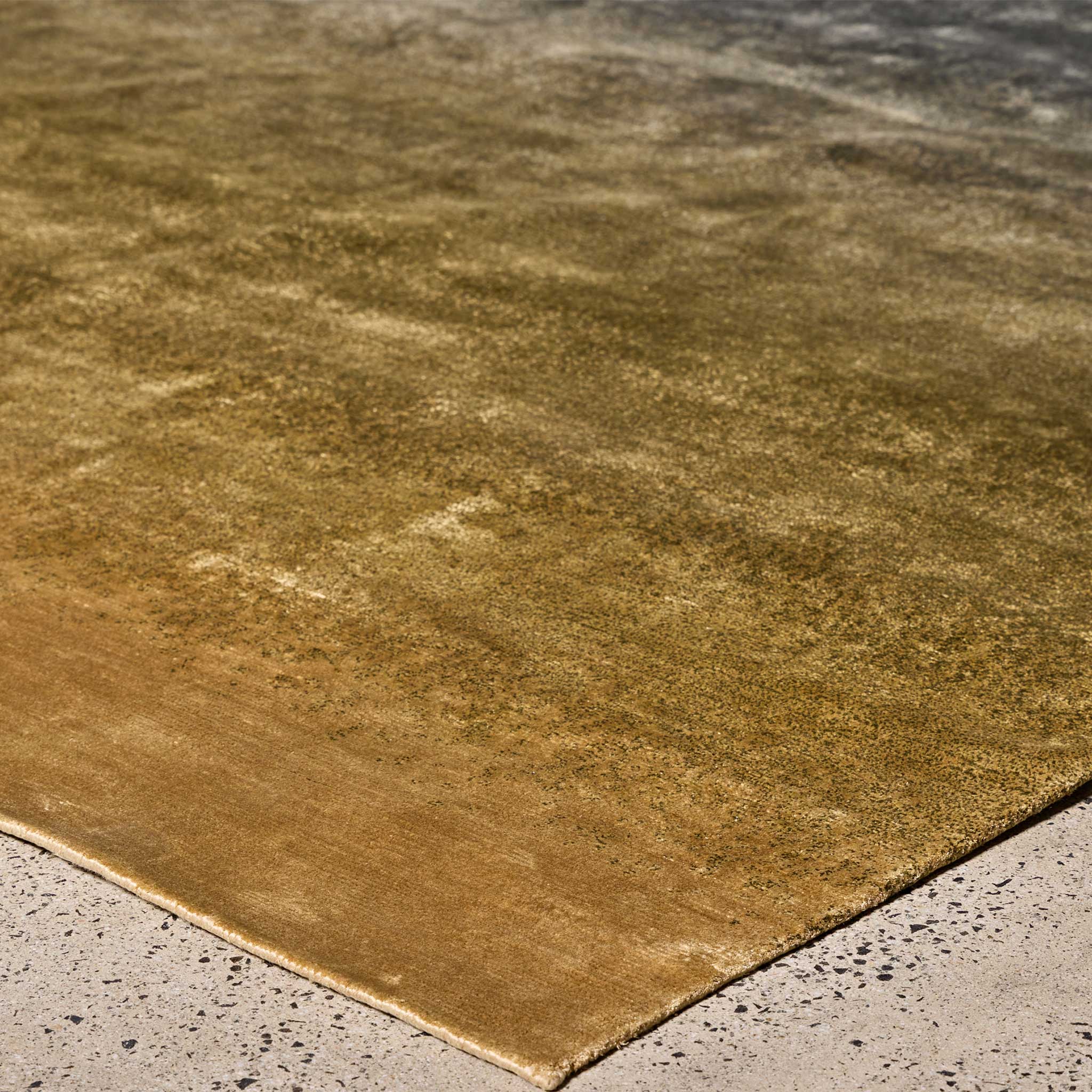 Woven in wool and art-silk, this rug achieves a flawless transition of its complex metallic tones, mirroring the smooth surfaces of polished brass as the colors evolve. The art-silk threads subtly catch the light, enhancing the gradient's fluidity and adding a refined luster reminiscent of polished brass and the intriguing iridescence of petrol. This meticulous craftsmanship ensures a stunning, flawless effect, a testament to Tappeti's dedication to exceptional design and the inherent artistry of hand-knotting.