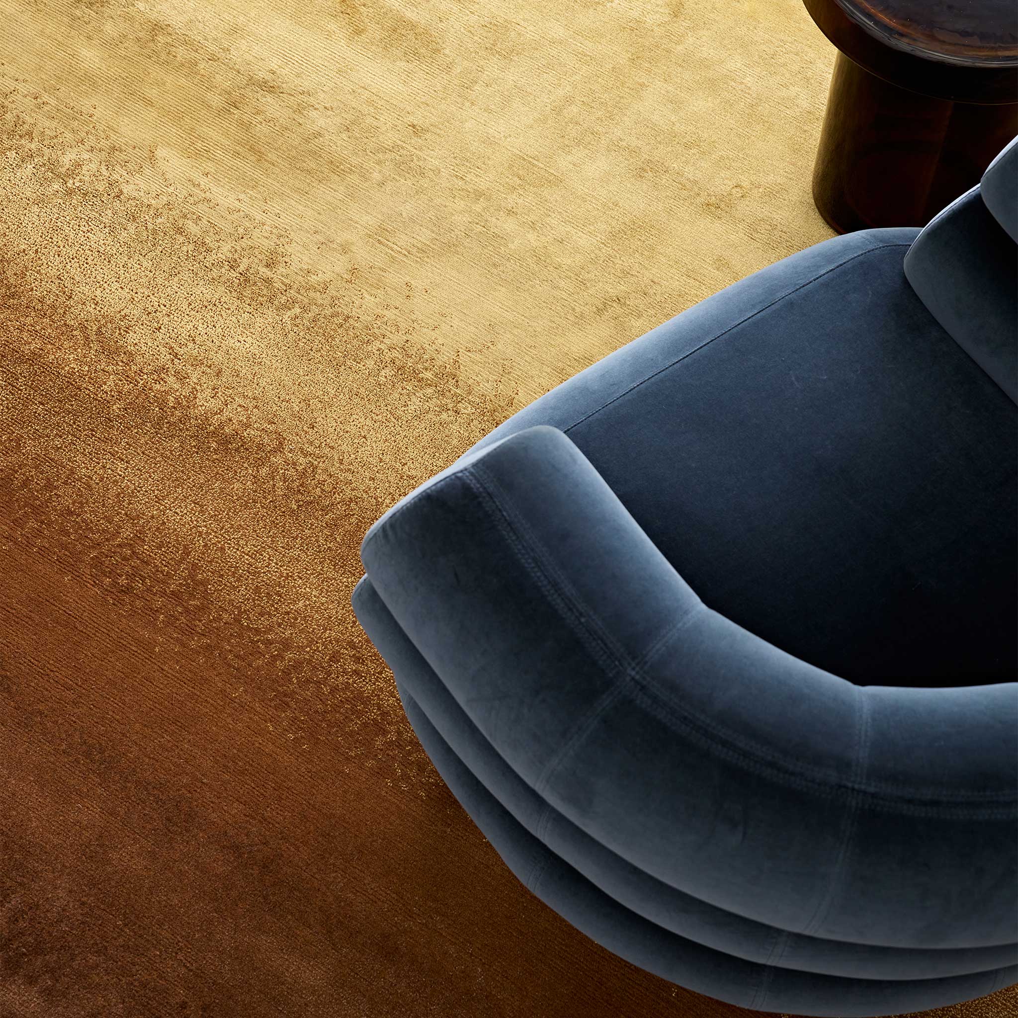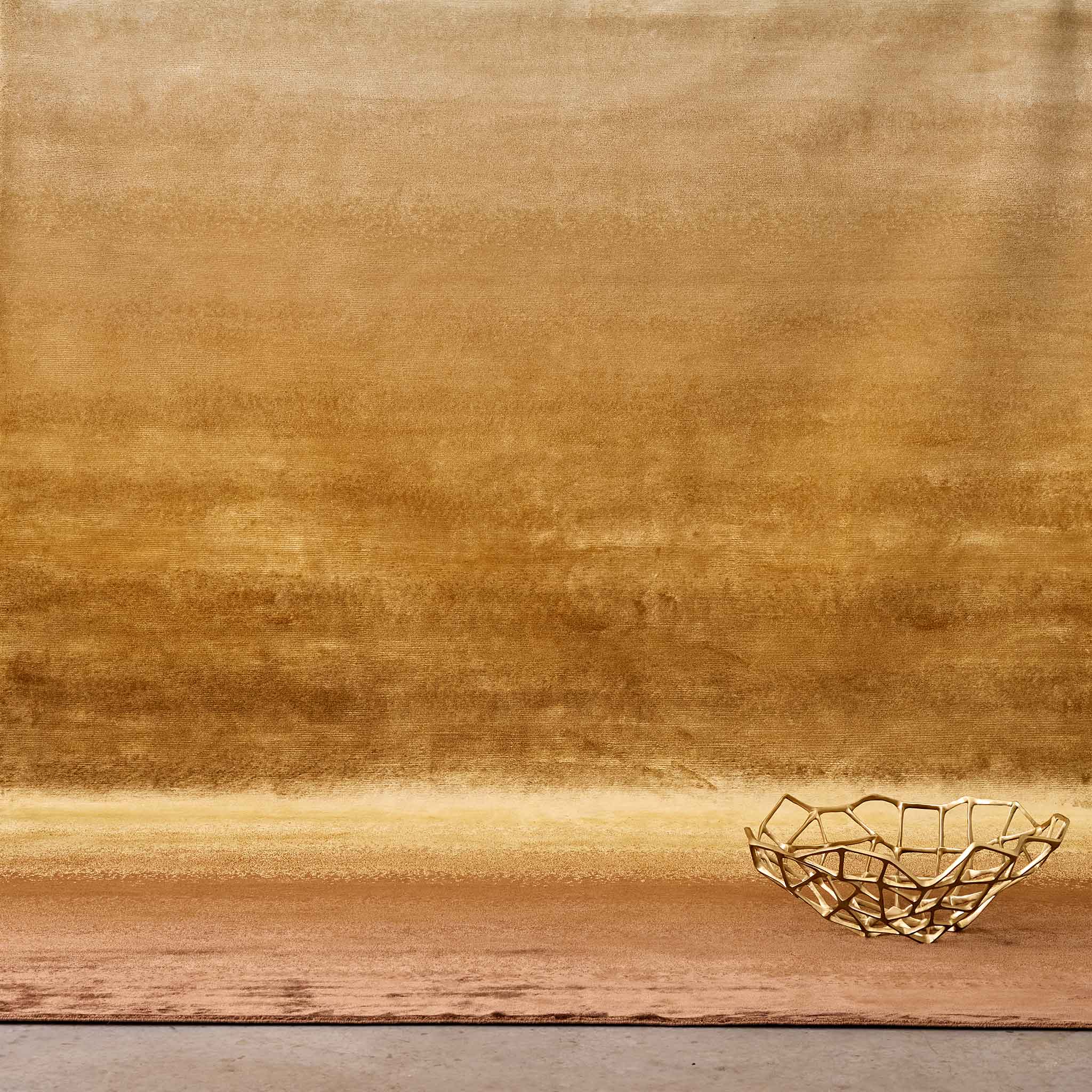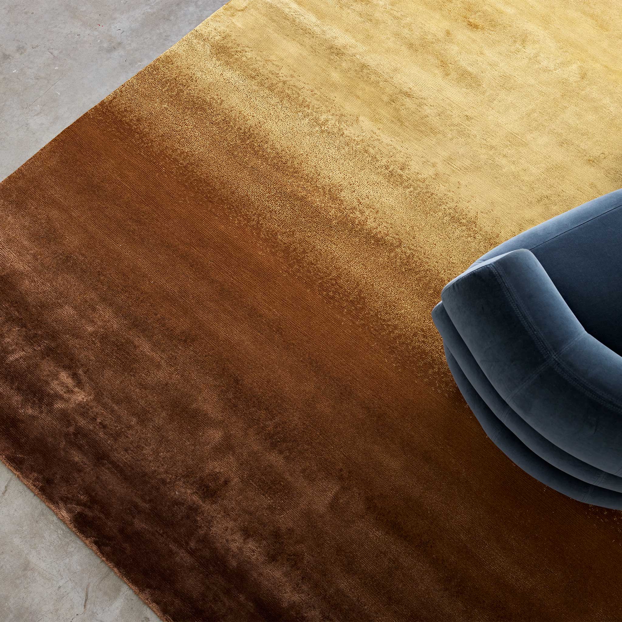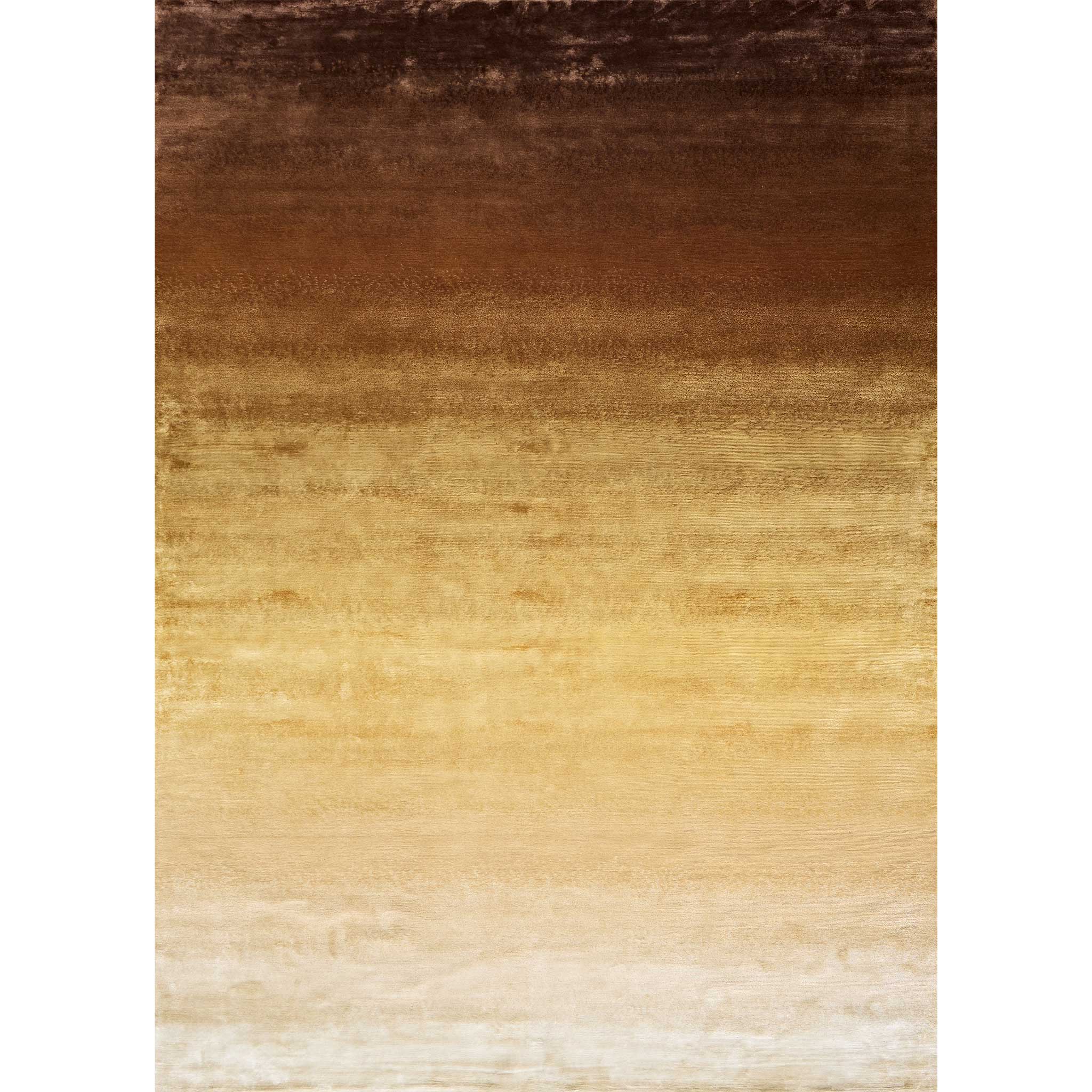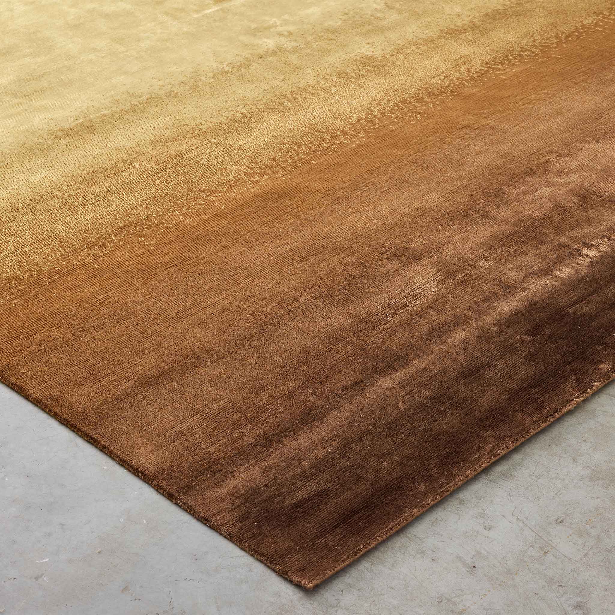 Introducing the Tappeti Gradient Oxide rug, a hand-knotted statement piece that captures the nuanced beauty of gradual oxidation and a richly layered texture. Witness a captivating gradient emerge, where the initial brightness of champagne subtly tarnishes into the warm, burnished tones of shimmering gold, before settling into the deep, earthy umber of chocolate brown – a unique color evolution evoking the subtle iridescence and depth of a naturally aged patina.