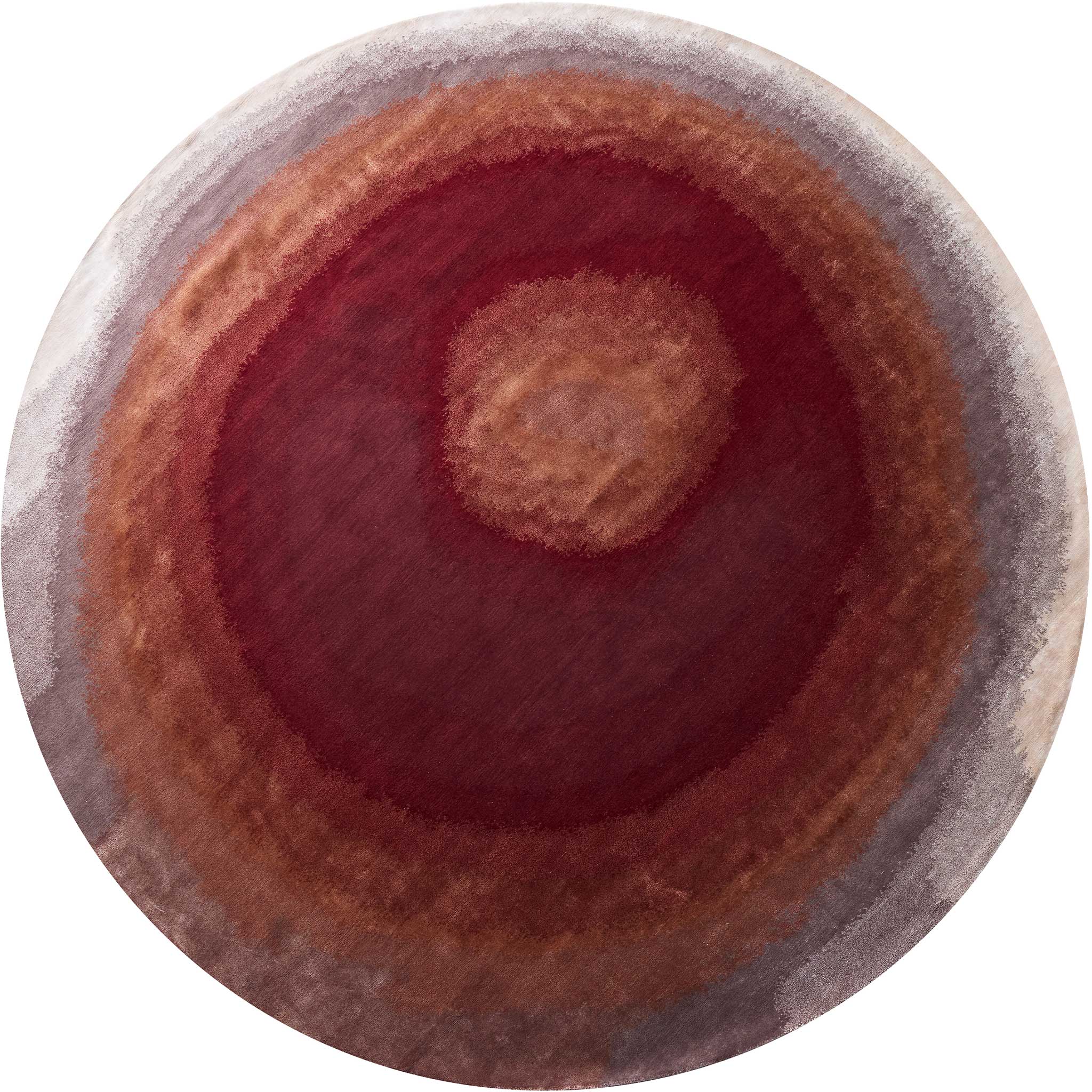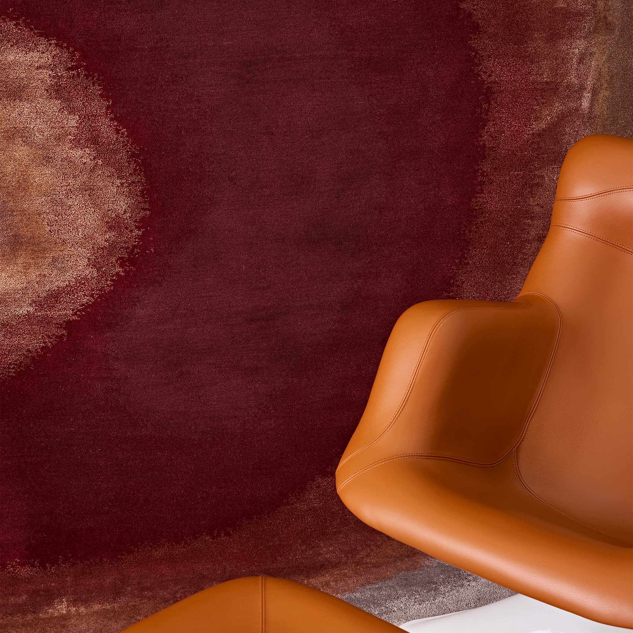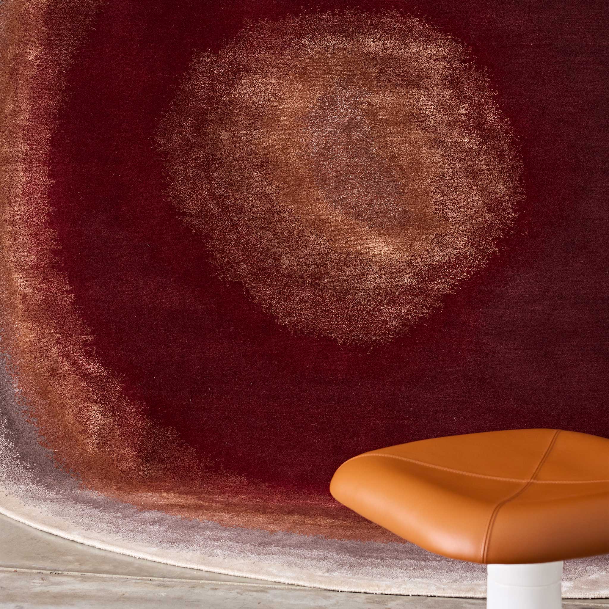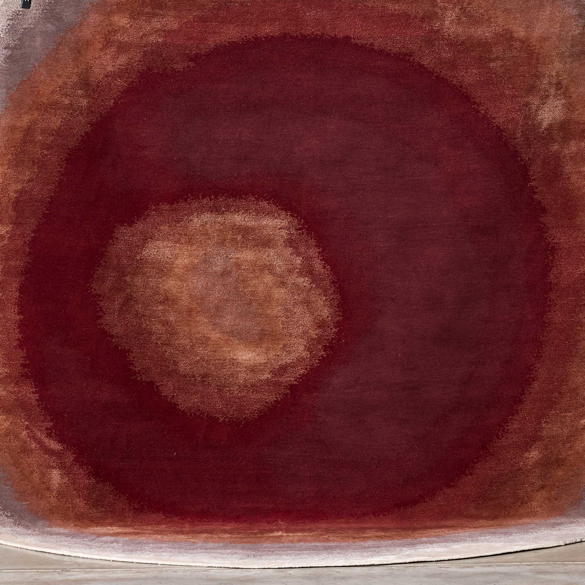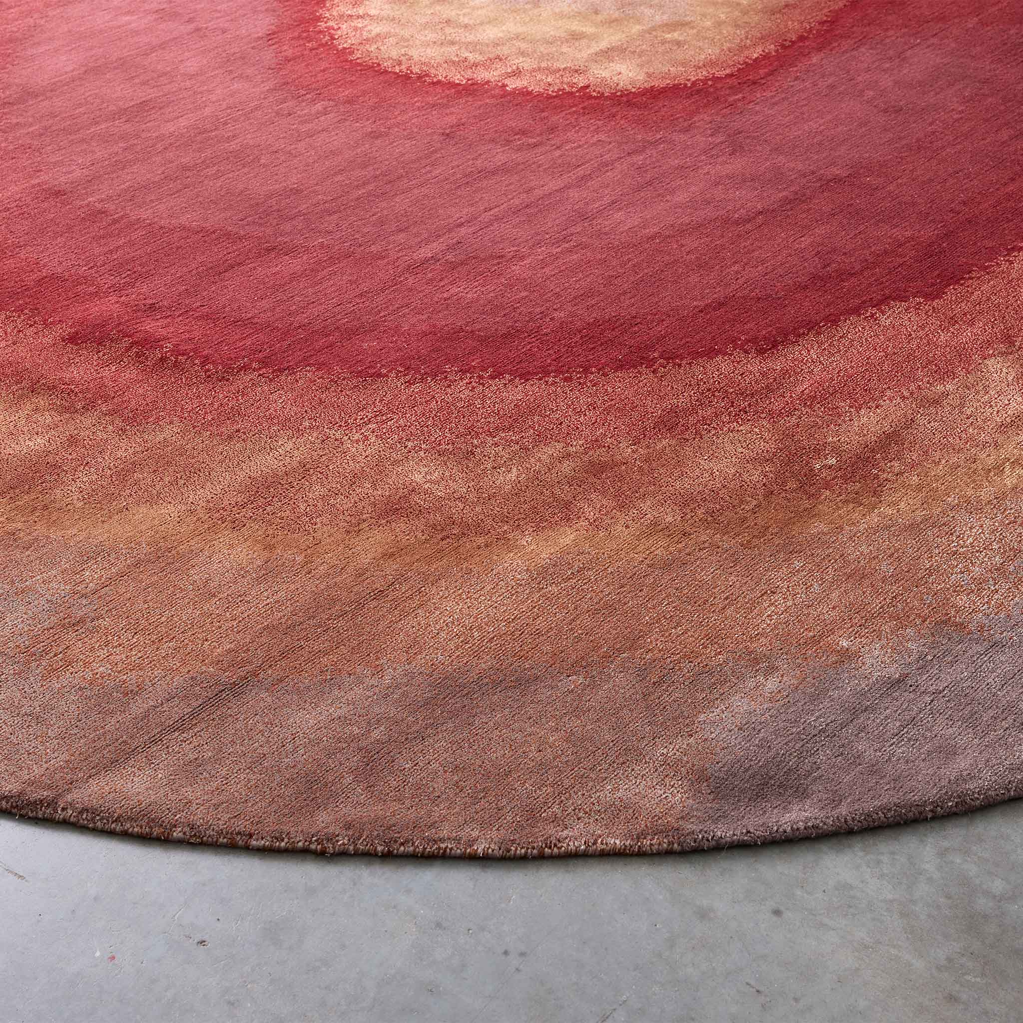 Behold the Tappeti Gradient Ruby rug, a hand-knotted statement piece that injects any interior, be it residential or commercial, with a powerful narrative of color and luxurious cut pile texture. From a concentrated core of intensely rich ruby red, a compelling gradient boldly expands, its fervent warmth transitioning through vibrant burnt orange before finding a sophisticated anchor in softly grounding neutrals – a striking visual journey that imbues spaces with passionate energy and refined elegance.