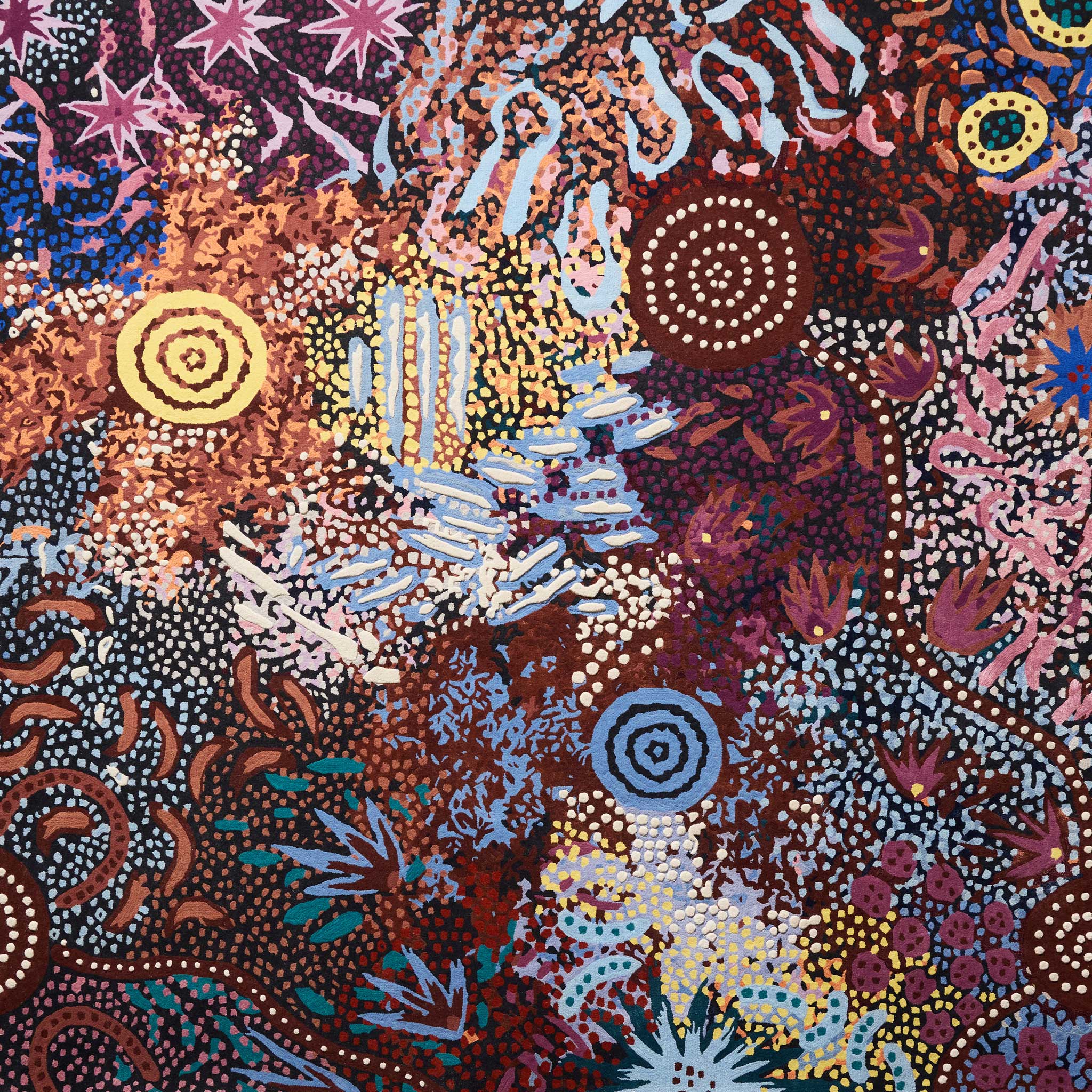 This country is sacred, warm and beautiful. The colours and symbols represent everything about the land of where my grandmother was born and raised - bushtucker, bush flowers, waterholes, love, marriage, dancing, singing, and womens ceremonies are all connected into the painting and more.