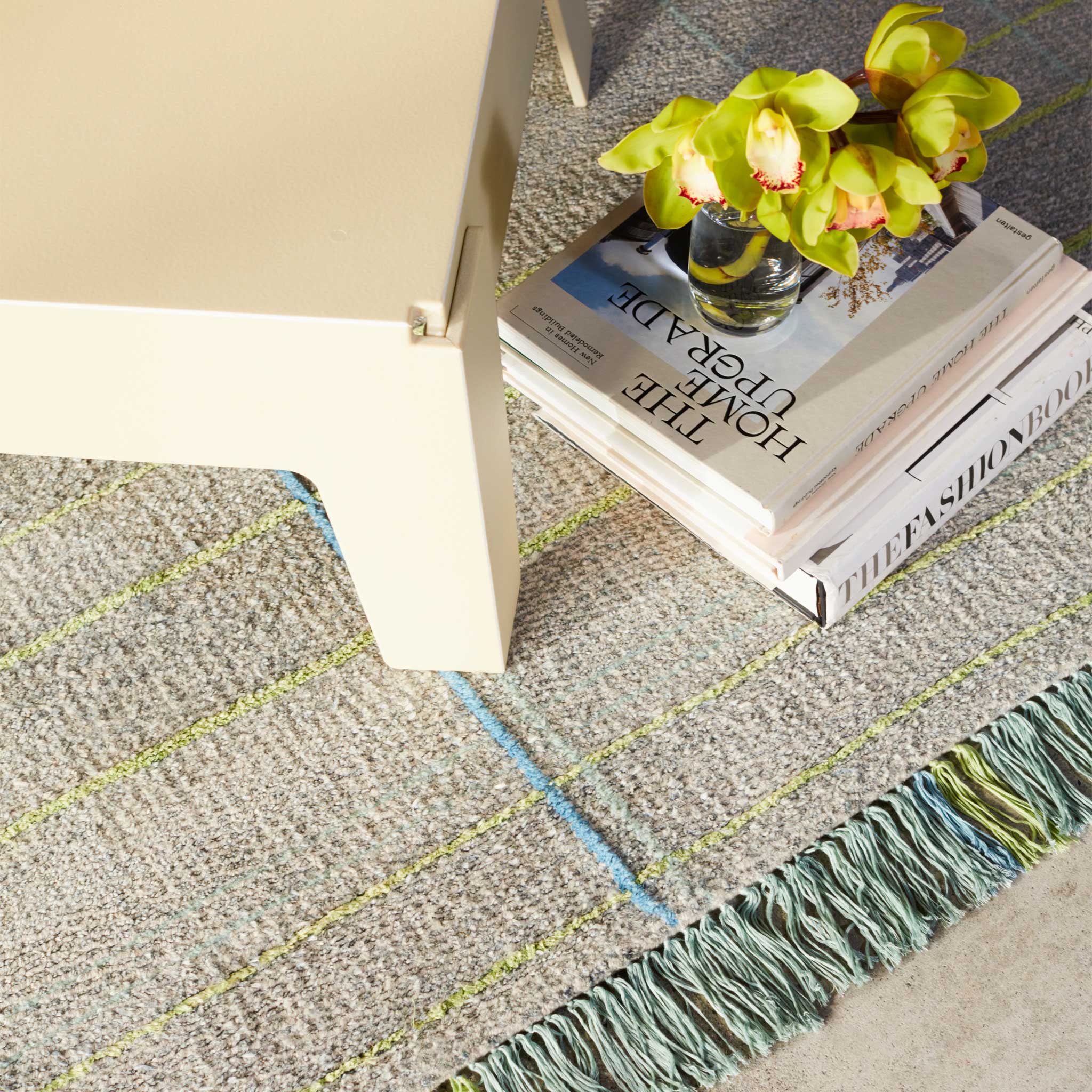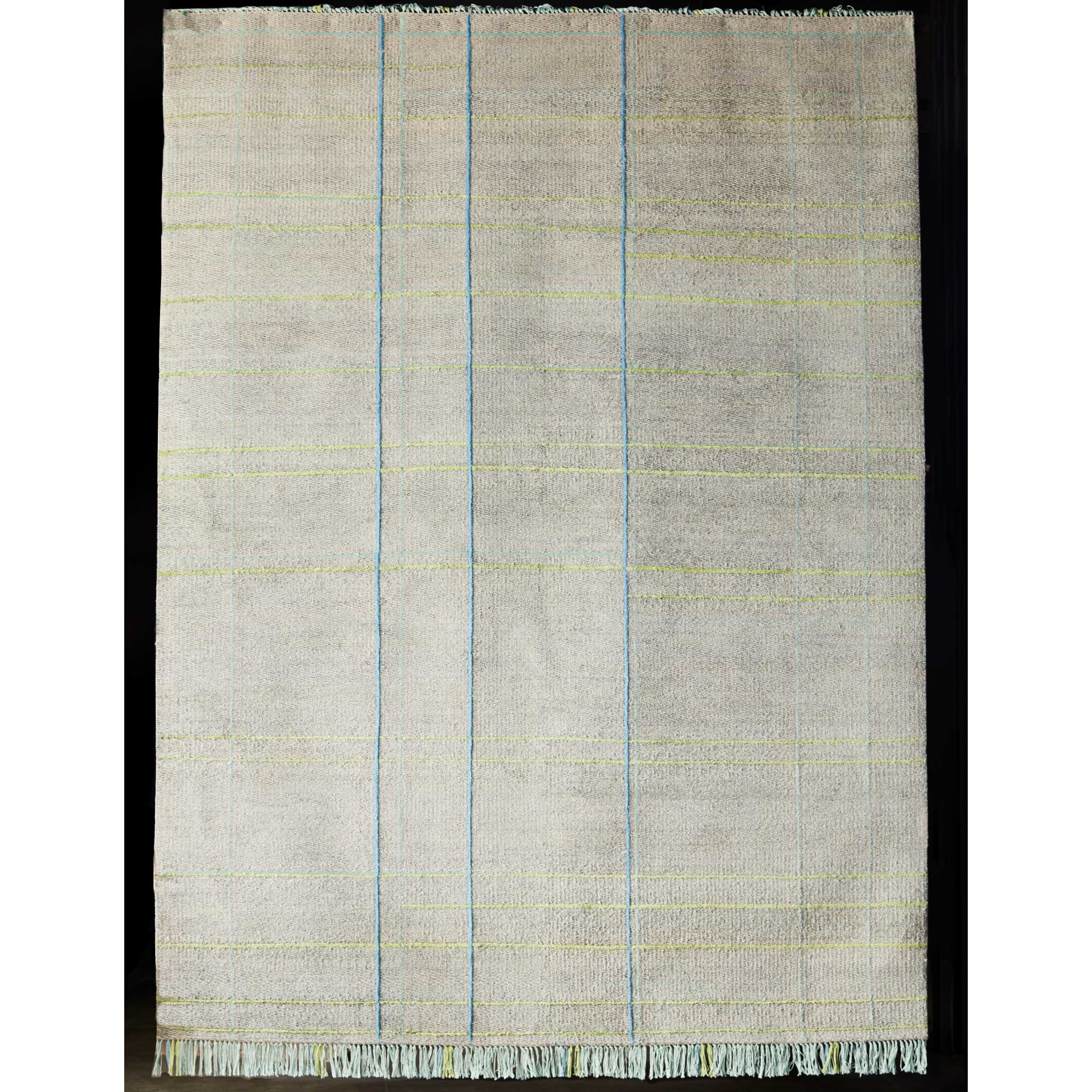 Silvery grey and sky blue are paired to create the base grid of this rug. A linear motif, inspired by a traditional plaid, of marine blues and acid green is distorted and reimagined with line work conceived in 2 layers loop pile and raised hemp this rug has a dynamic movement.