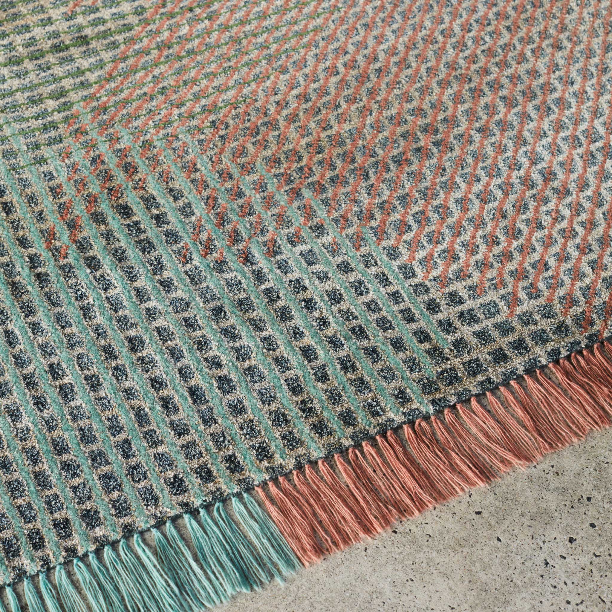 The warp and weft of the loom are the basis for an improvisation in directional shapes, textures and chromatics. Grids are transformed, convoluted and overlaid, enhancing the visual appreciation and guiding the eye through space. Colours reveal graduations of hue, harmonic spectrums and symmetries of light and shade.