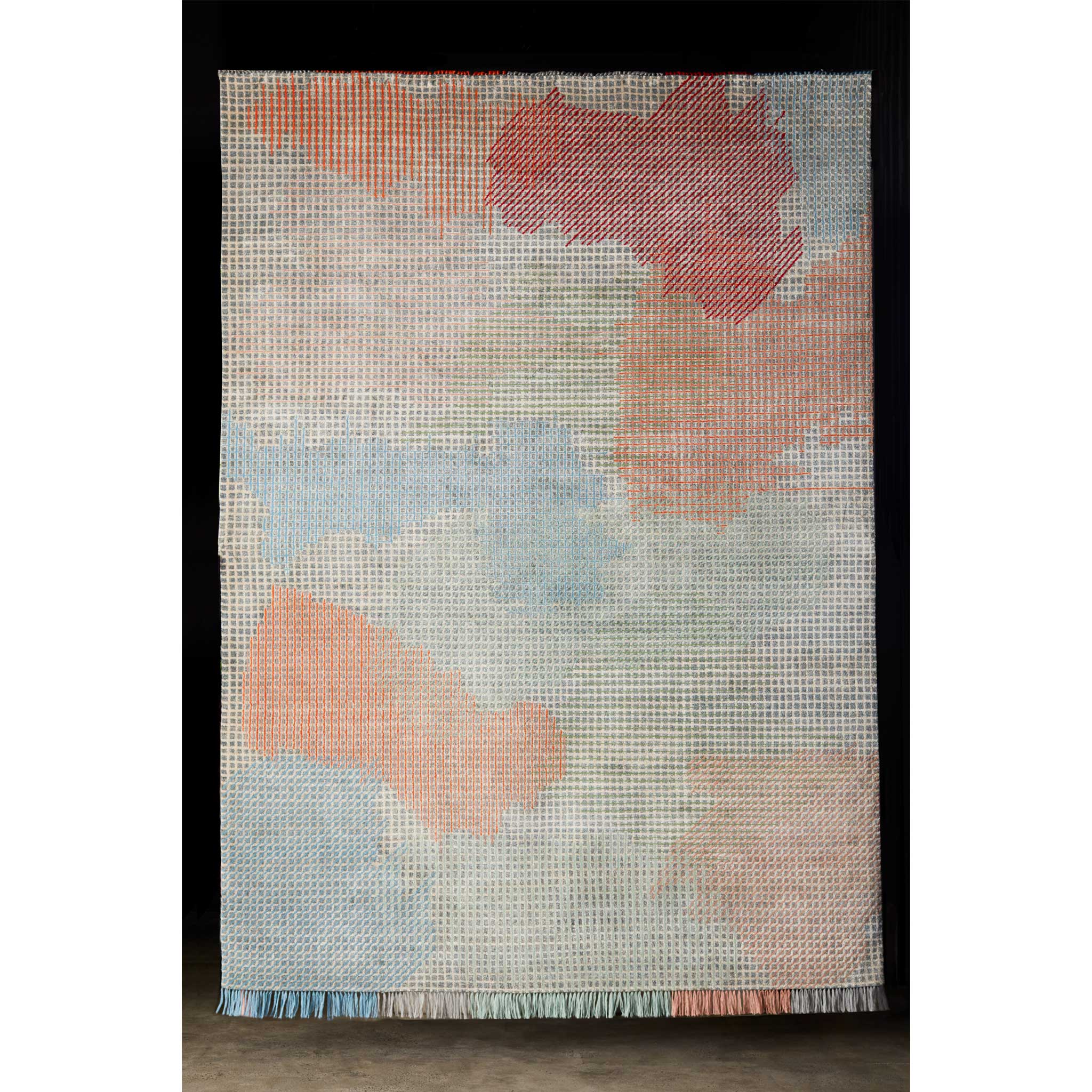 A cool colour palette of storm, denim and lunar form the gridded base of this rug, with colour fields built of contrastingly coloured lines layered above.