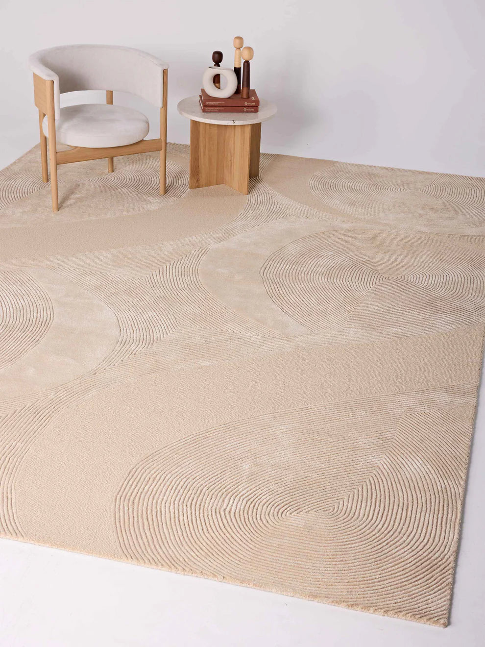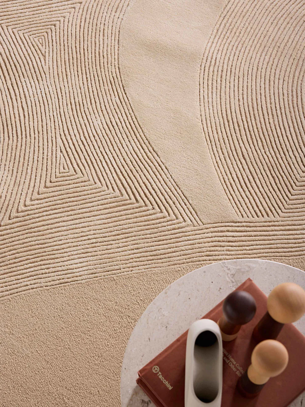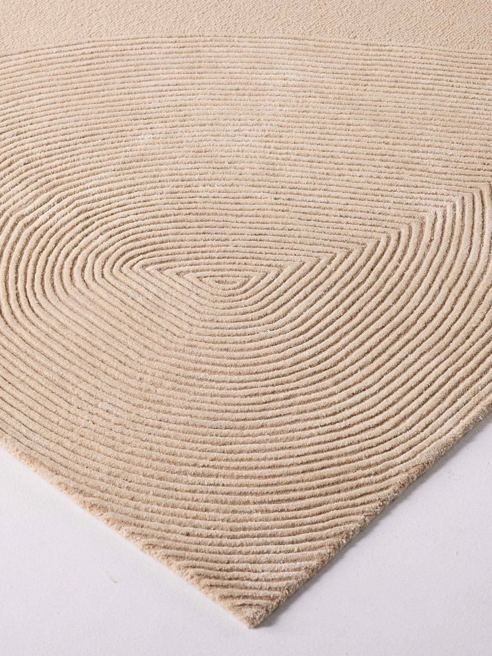 "Huit is a creation that captures the serene essence of nature, transformed into a tactile and visual experience. Inspired by the art of sculpting sand into mesmerizing patterns, the rug evokes a sense of calm and contemplation, inviting one to experience the quiet beauty of simplicity. The palette of cream and taupe is carefully chosen to mimic the soft, timeless tones of sand, emphasizing a connection to the earth. The design is a dance of lines—gentle waves, straight paths, and concentric circles—that come together to create a sense of harmony and balance. Each pattern is meticulously crafted, offering a visual and sensory journey. In "Huit," space and texture are as much a part of the design as the patterns themselves. The absence of embellishments allows the intricate design to take center stage, celebrating the beauty found in emptiness and the elegance of restraint. This rug offers a moment of stillness in the midst of a busy world, allowing you to reconnect with the natural rhythms of life.”