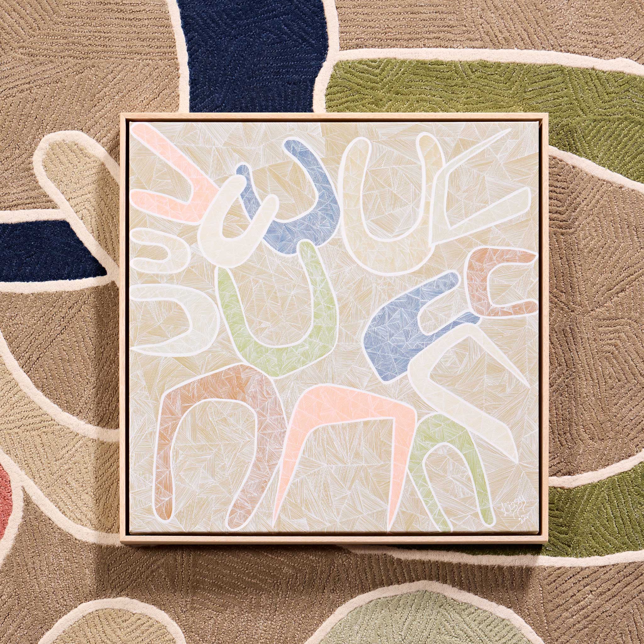 This painting is made up of two main elements; firstly, a series of large U-shaped symbols that in Aboriginal culture mean an individual. I have painted these symbols in abstract geometric shapes and orientations to symbolise differences. They’re painted in unique individual colours that are inclusive and warming. Then prominently featuring is the traditional age-old technique of cross-hatching. The significance is in the individual symbols being tethered by the cross-hatching technique. It represents ‘Ourselves’ coming together, celebrating achievements, accepting similarities and differences, individually and collectively while being yourself.