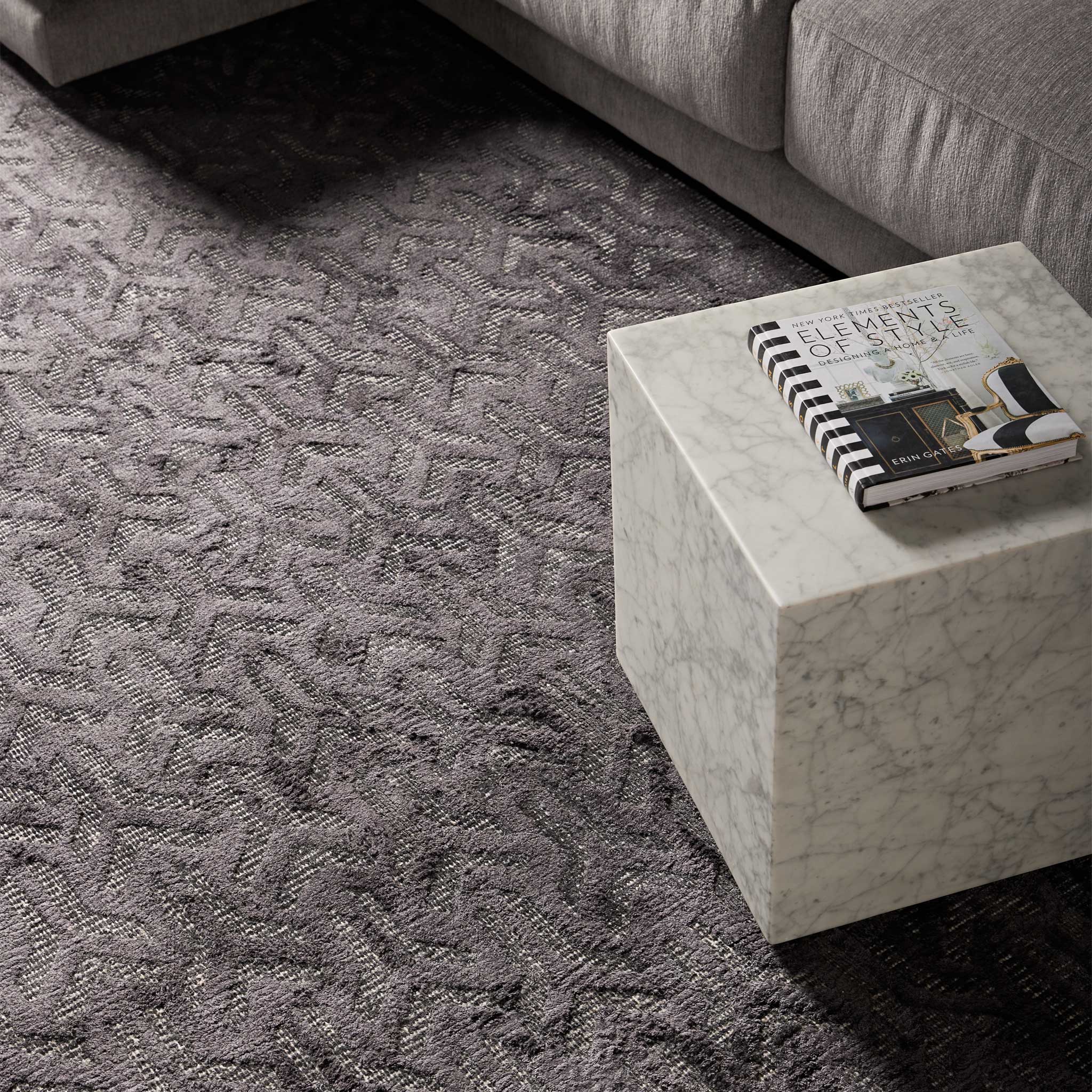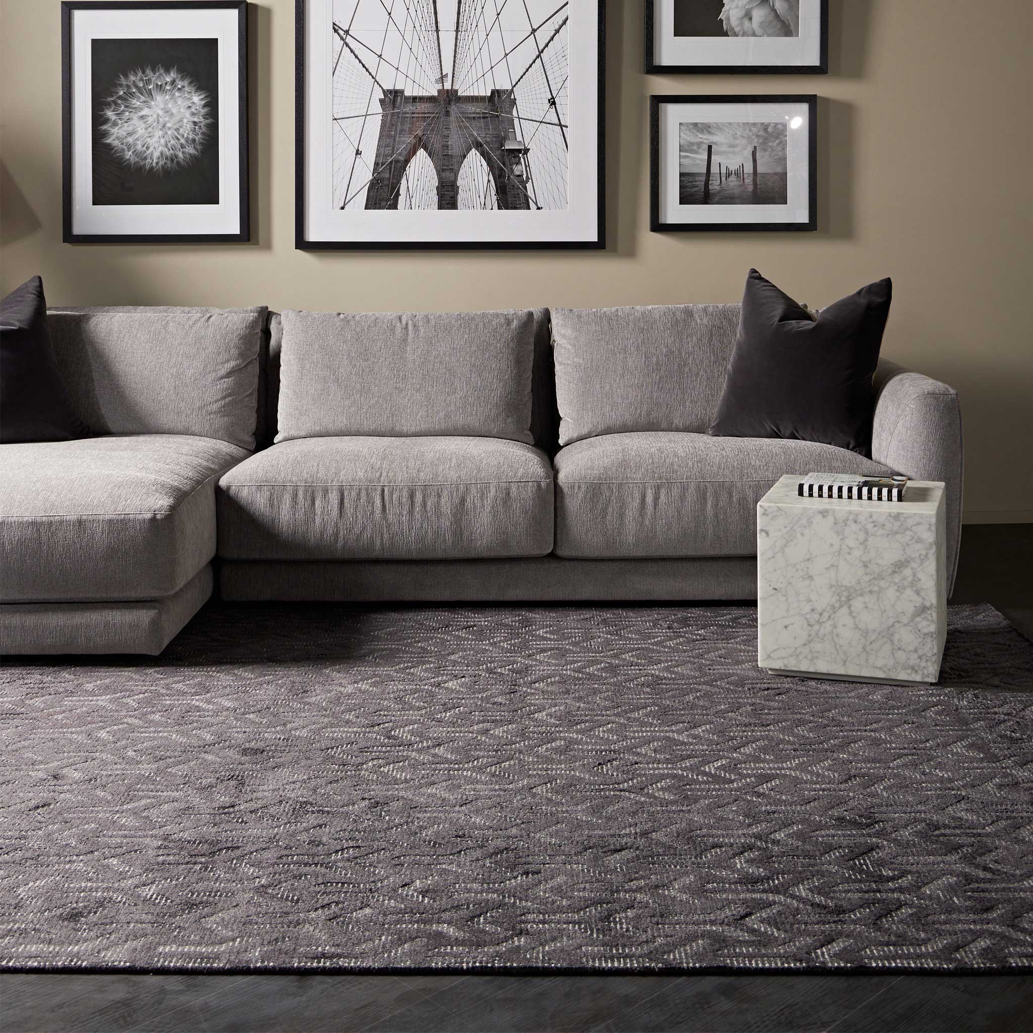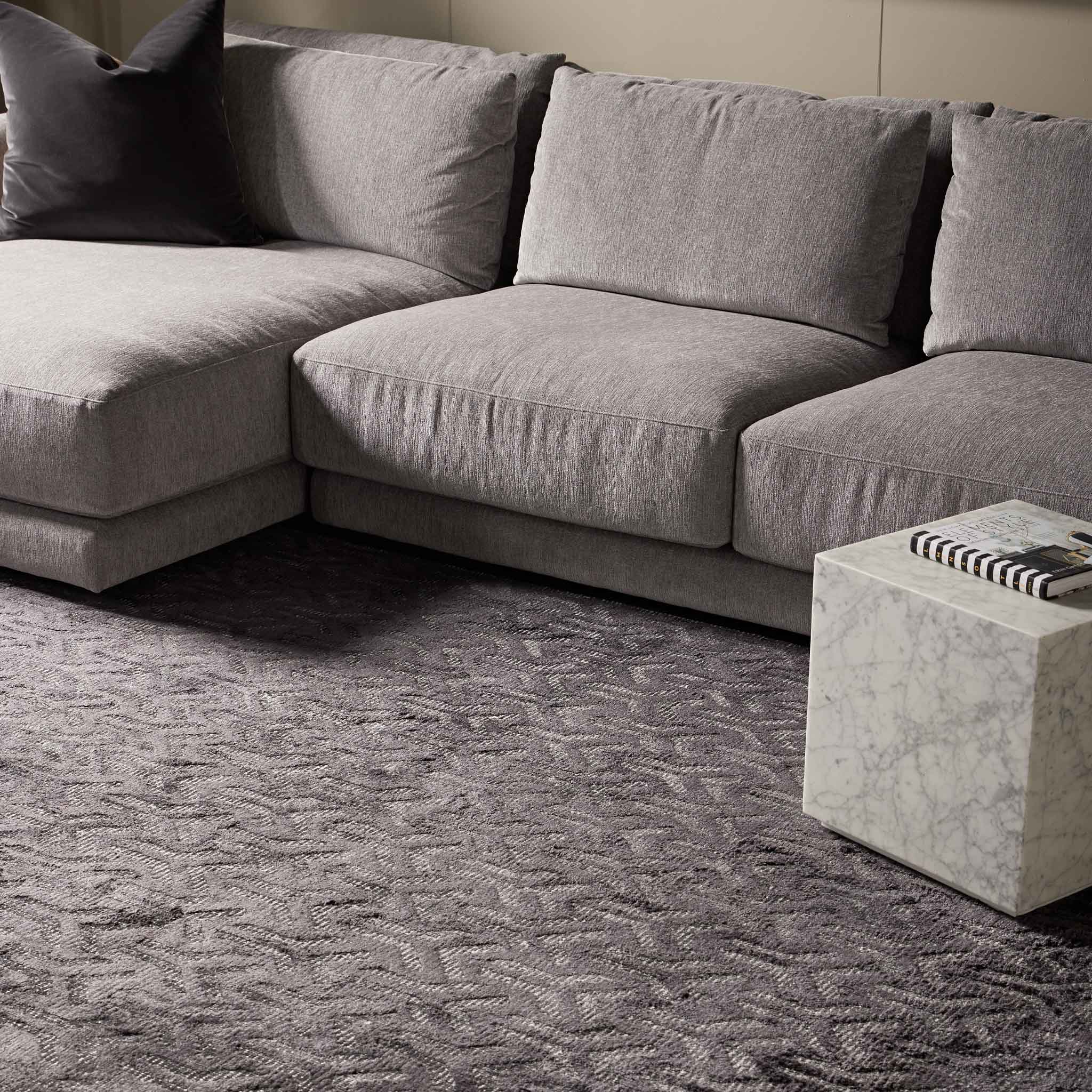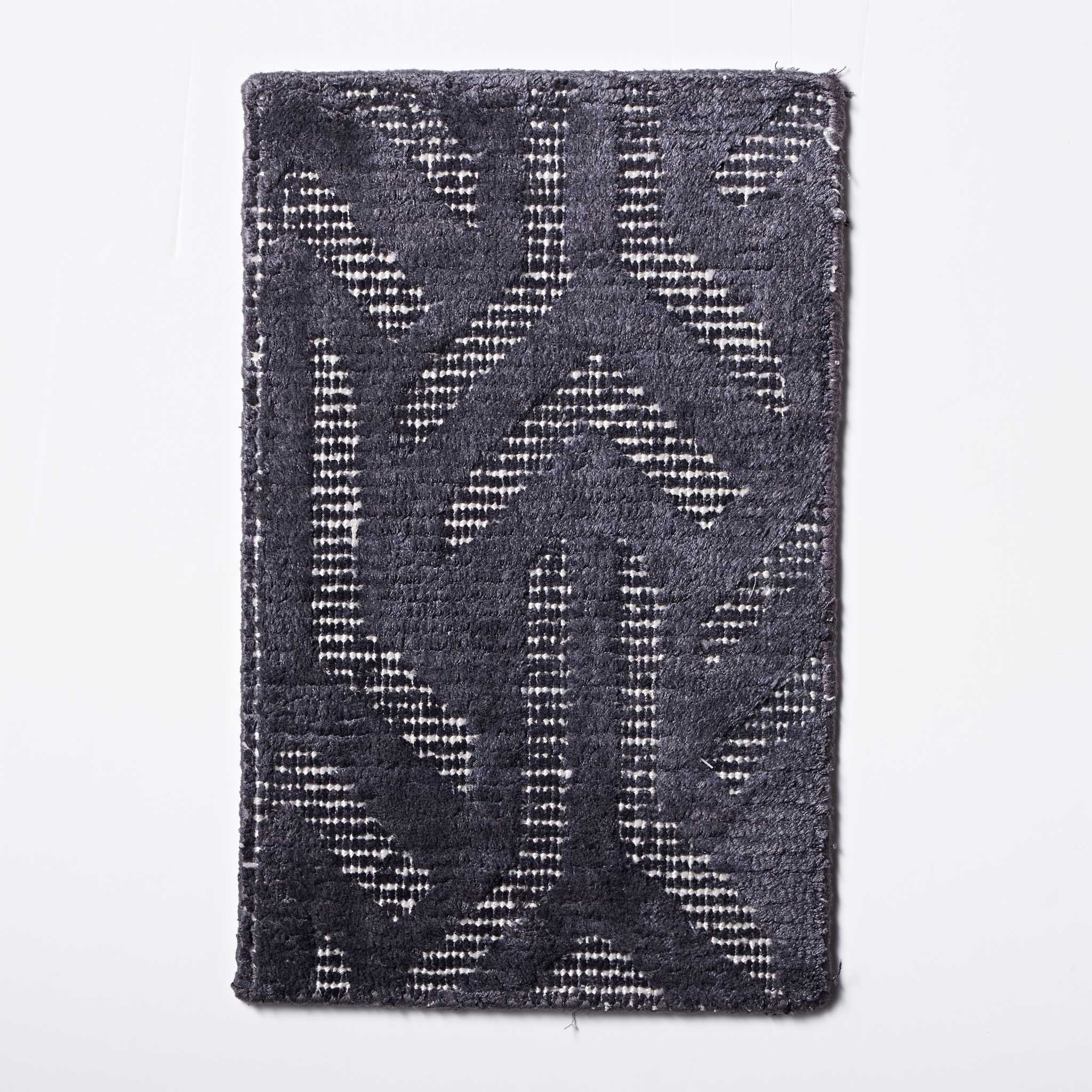 Hand-tufted with exceptional artistry, the Ora Arrow Charcoal rug combines the robust texture of wool loop pile with the subtle sheen of raised art-silk in a cut pile. Manufactured to a pile height of 12mm and a substantial weight of 3.00kg/m2, its construction creates a distinct tactile and visual contrast. The crisp white base accentuates the sharp lines of the charcoal geometric repeat, lending a sense of precision and purposeful direction to the design.