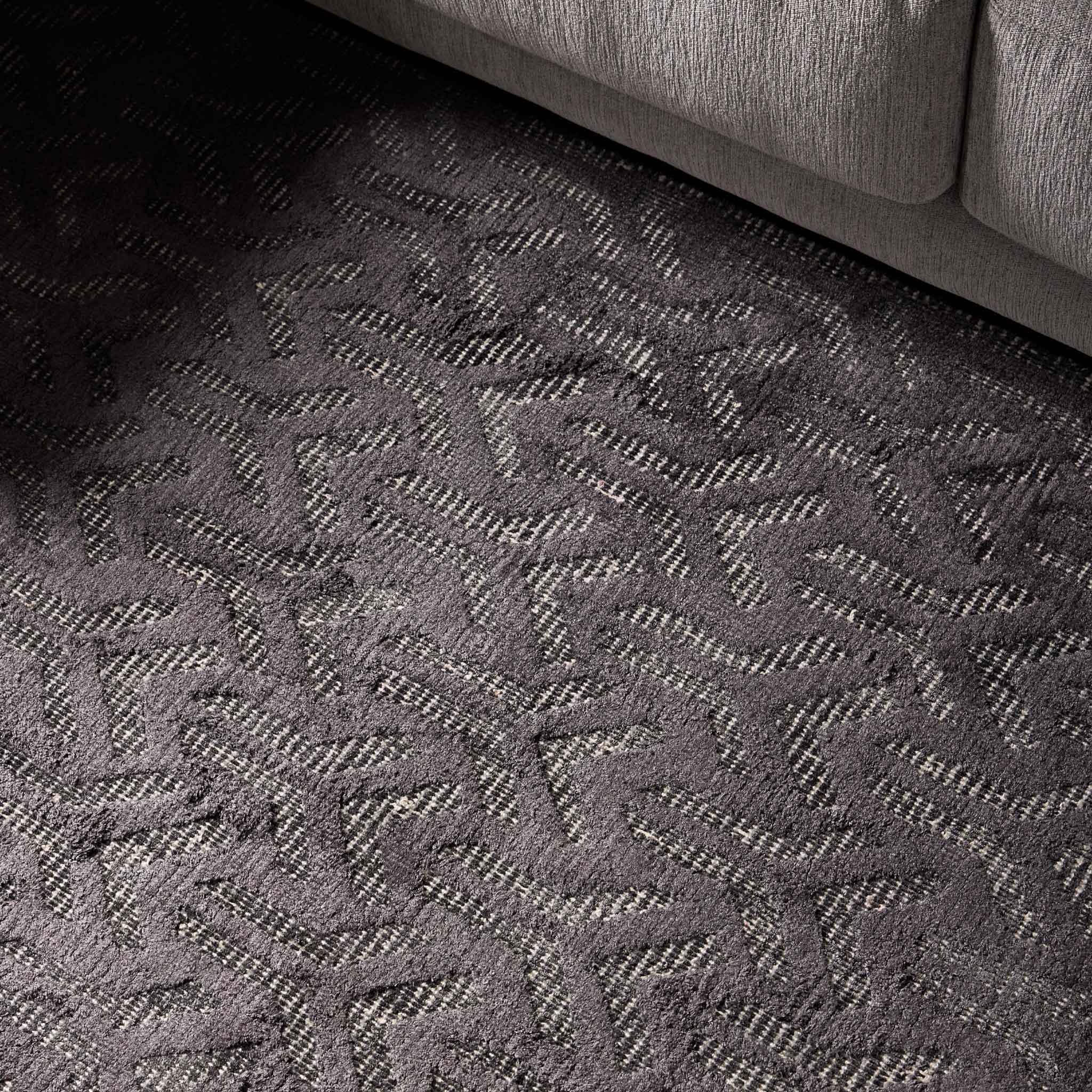 Make a bold design statement with the Tappeti Ora Arrow Charcoal rug. This piece features a striking graphic pattern executed with a charcoal and white loop pile base, providing a strong visual foundation. A raised charcoal art-silk detail forms a compelling geometric repeat, adding a layer of sophisticated texture and focused energy, like a precisely aimed arrow.