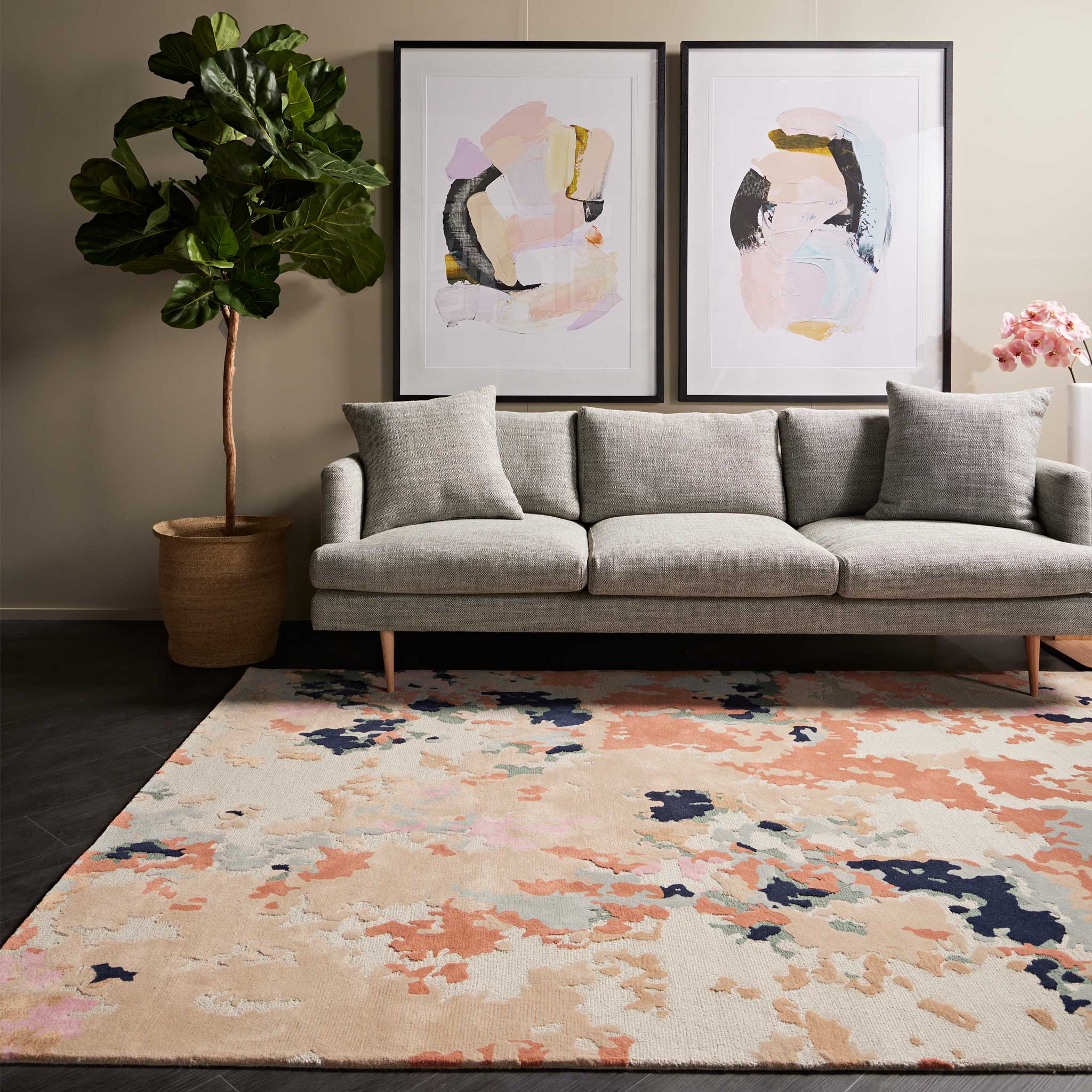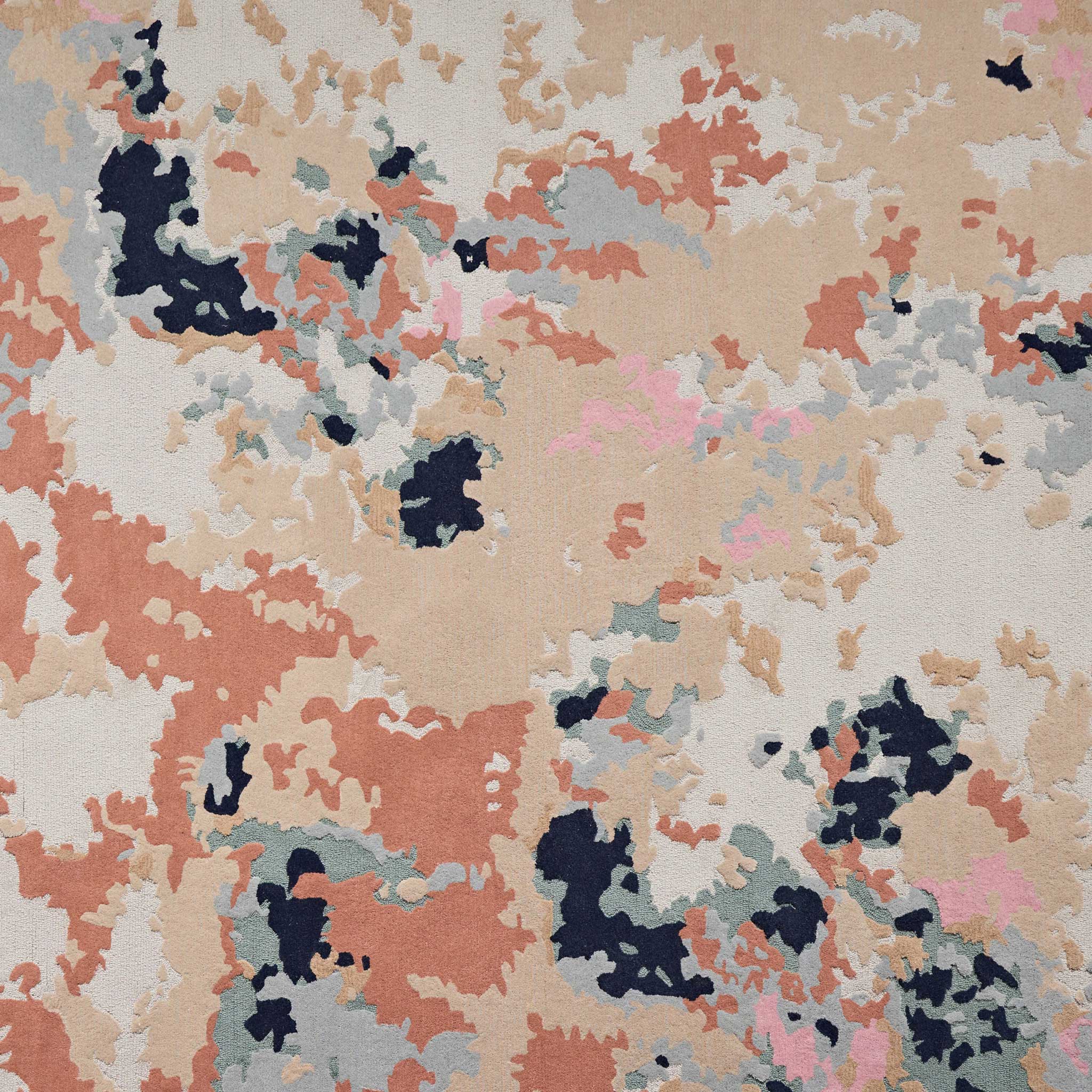 Dive into the vibrant spectacle of the Tappeti Ora Faded Coral rug, an approachable entry into world-class textile design. This piece draws profound inspiration from the kaleidoscopic beauty of a thriving coral reef, featuring a mesmerizing blend of watercolours that blur into each other, creating a playful contrast. Tonal corals and warm neutrals are layered with deep navy and soft cool grey hues, punctuated by splashes of vibrant pink, evoking the dynamic underwater ecosystem.