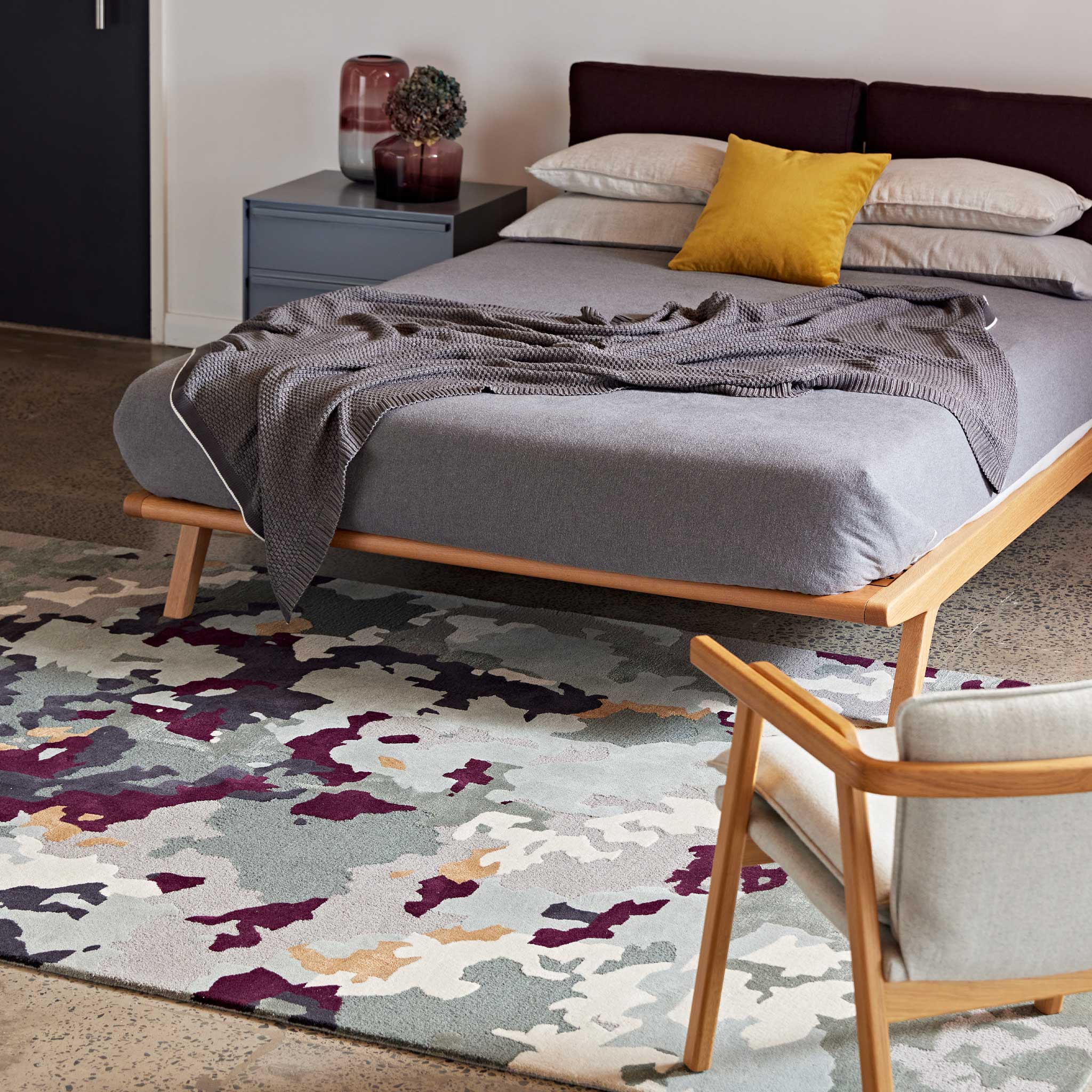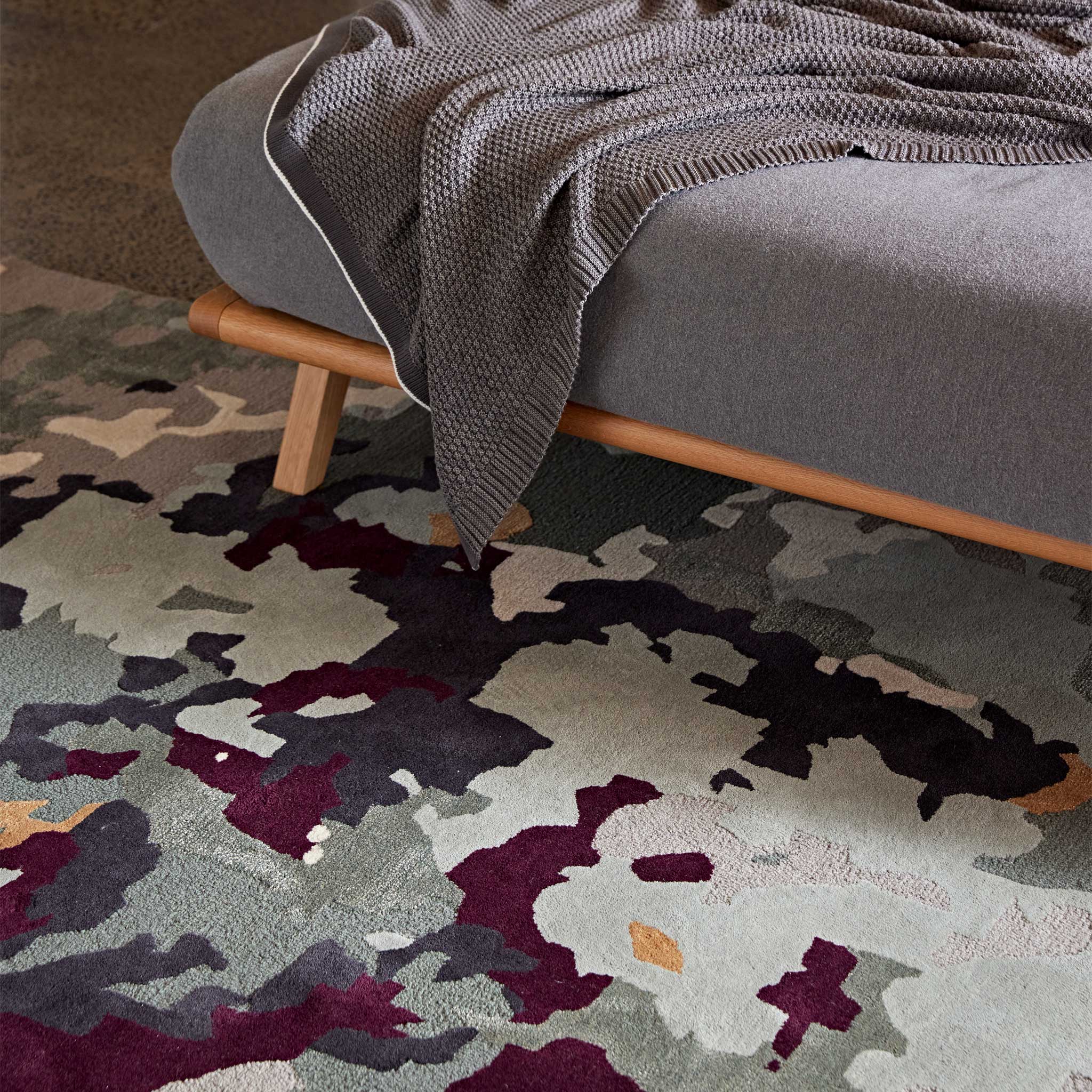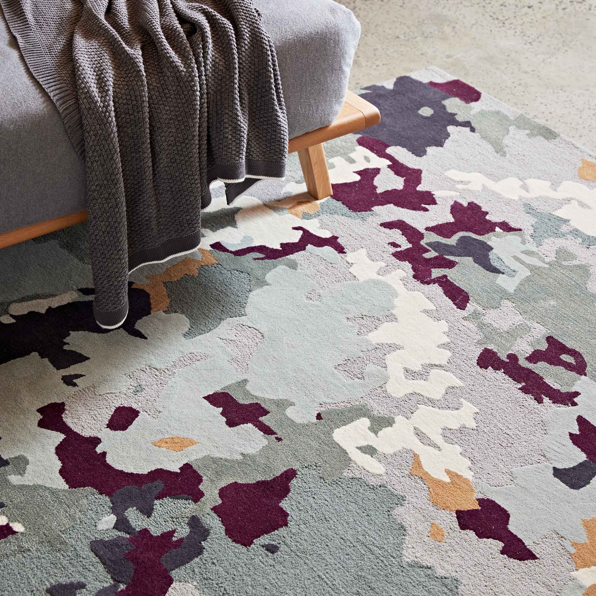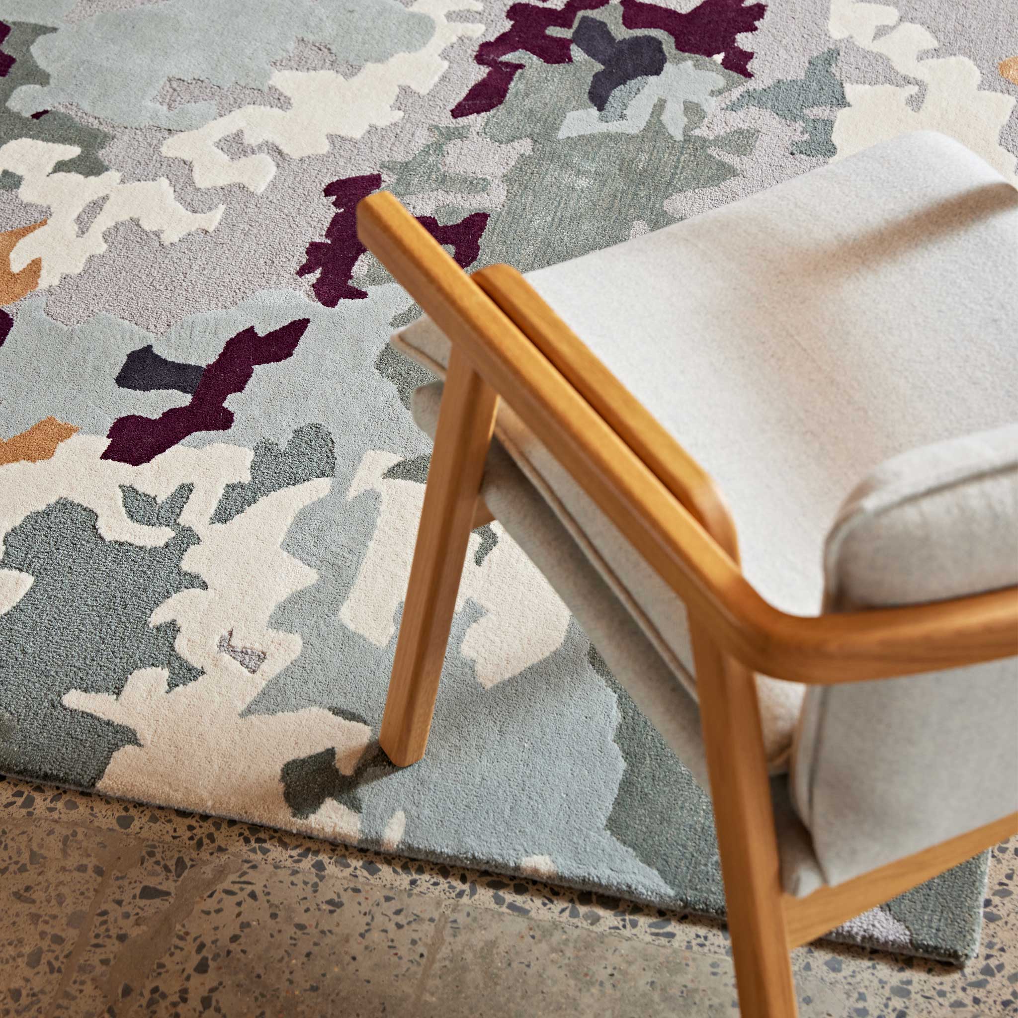 Unfurl the natural elegance of the Tappeti Ora Faded Eucalypt rug, an approachable entry into world-class textile design. This piece draws profound inspiration from the Australian eucalyptus forest, where sunlight filters through a vibrant canopy and ancient bark, creating a bold contrast. Its watercolour effects blur tonal cool greys, rich burgundy, and luminous gold hues, evoking the layered, shifting colors of a majestic eucalypt landscape.