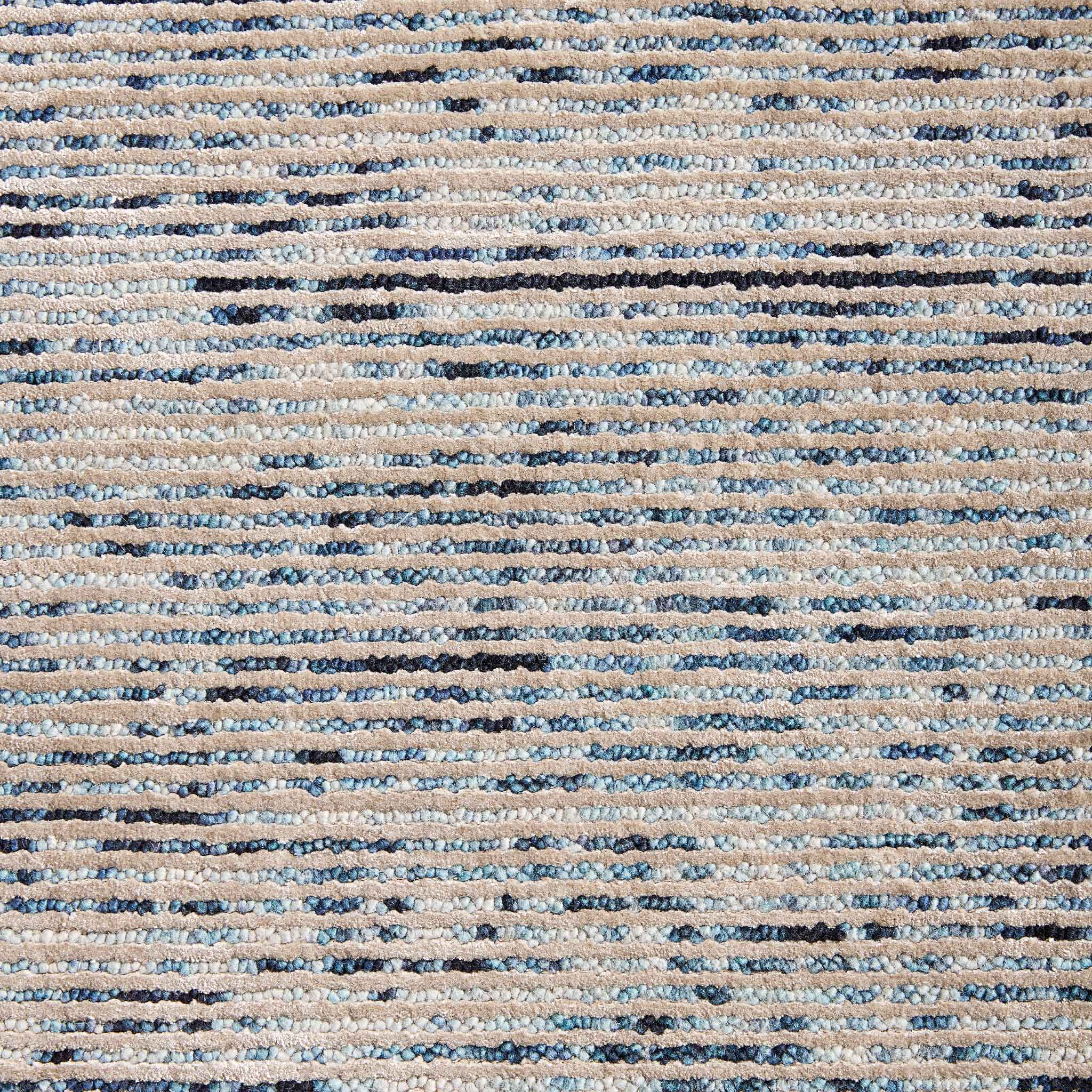 Hand-tufted with exceptional artistry, the Ora Raised Ombre Blue rug combines the soft foundation of felted wool loop pile with the lustrous peaks of art-silk cut pile. Manufactured to a pile height of 11mm and a weight of 3.00kg/m2, its construction creates a rich, three-dimensional surface. The meticulous hand-dyeing enhances the ombre's gradual flow, allowing each subtle tonal shift in blue to reveal new dimensions of light and depth, much like observing sunlight permeate the various strata of a deep-blue sea.