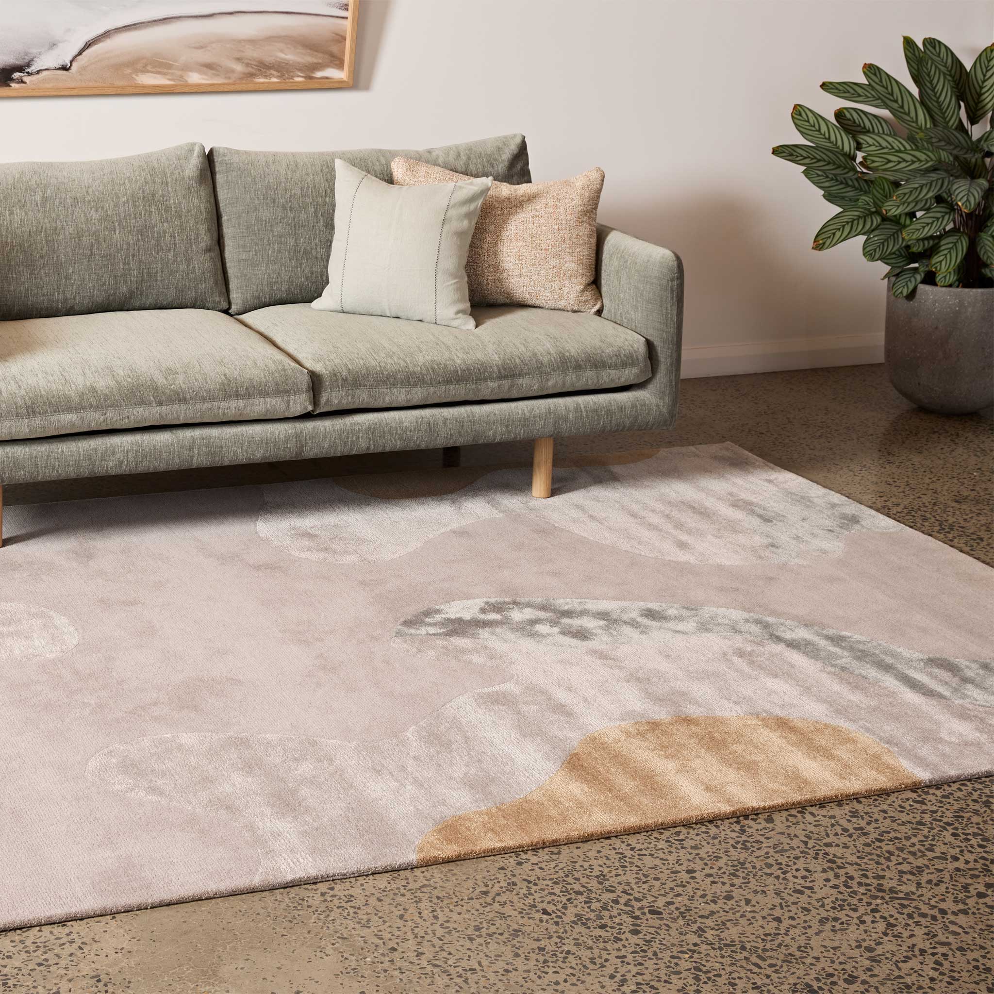 Embrace the graceful undulations of natural movement with the Tappeti Ora Swirl rug, an approachable entry into world-class textile design. This piece features organic swirling shapes that beautifully mimic the soft currents of water or the gentle flow of wind. Designed to add lustre and movement to a space, its fluid pattern in muted tones of pink, grey, and earth brings a captivating sense of natural dynamism to any interior.
