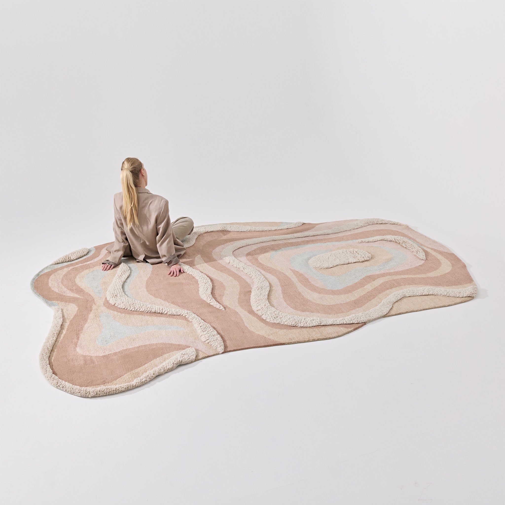 The soft, earthy rose shades of the Petra Rose rug infuse interiors with a sophisticated warmth, a whisper of history and wonder. Its unique geological pattern and the tactile landscape of its pile invite amazement and contemplation.