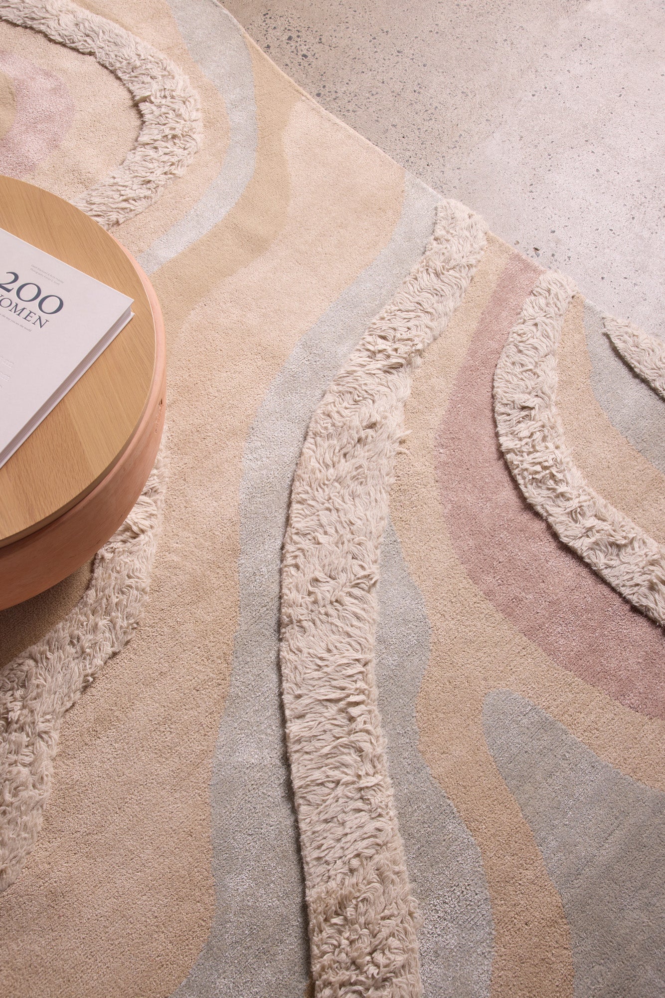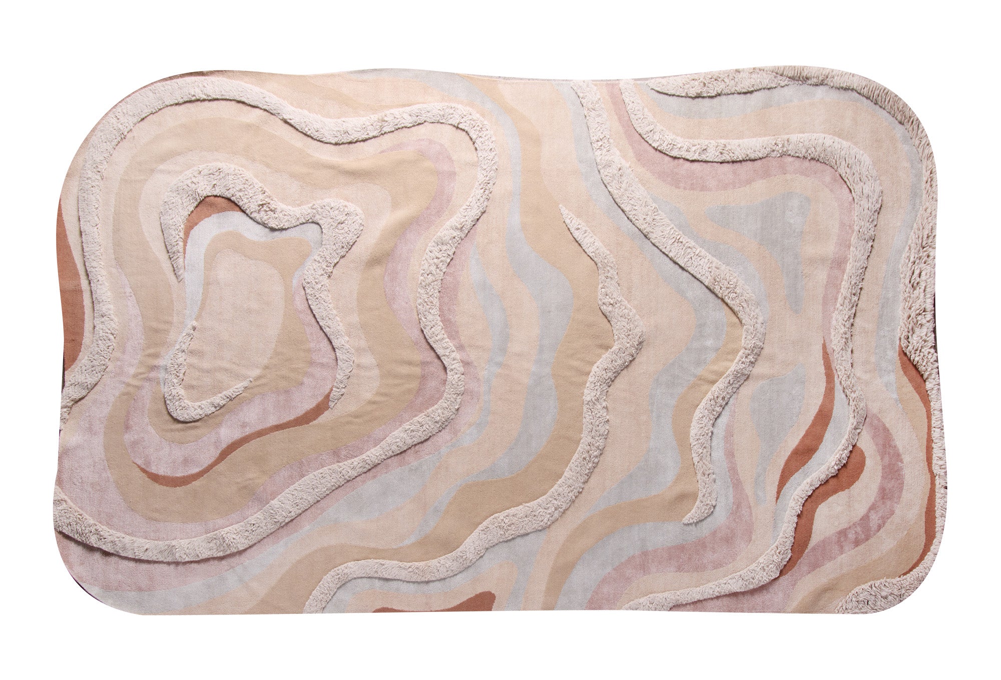 The soft, earthy rose shades of the Petra Rose rug infuse interiors with a sophisticated warmth, a whisper of history and wonder. Its unique geological pattern and the tactile landscape of its pile invite amazement and contemplation.