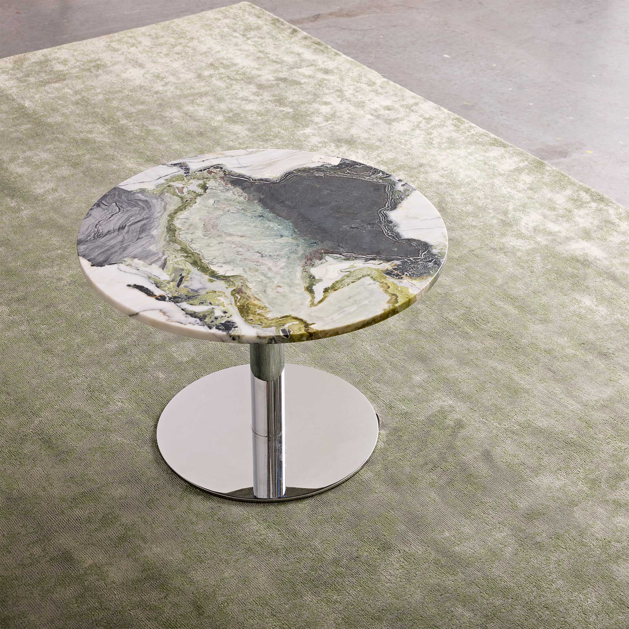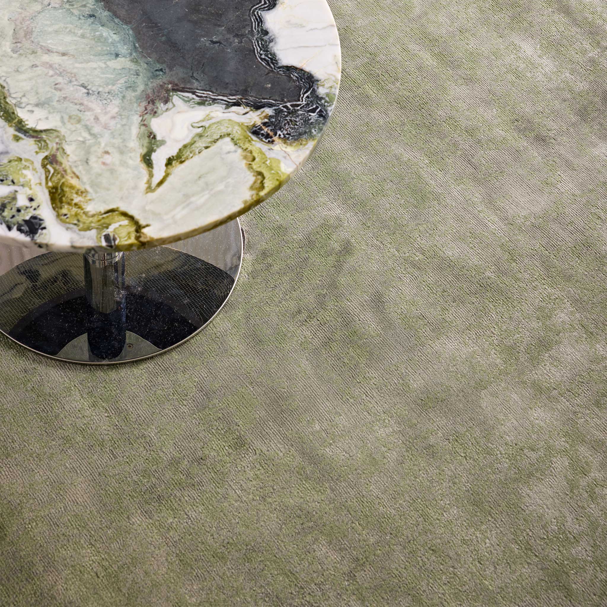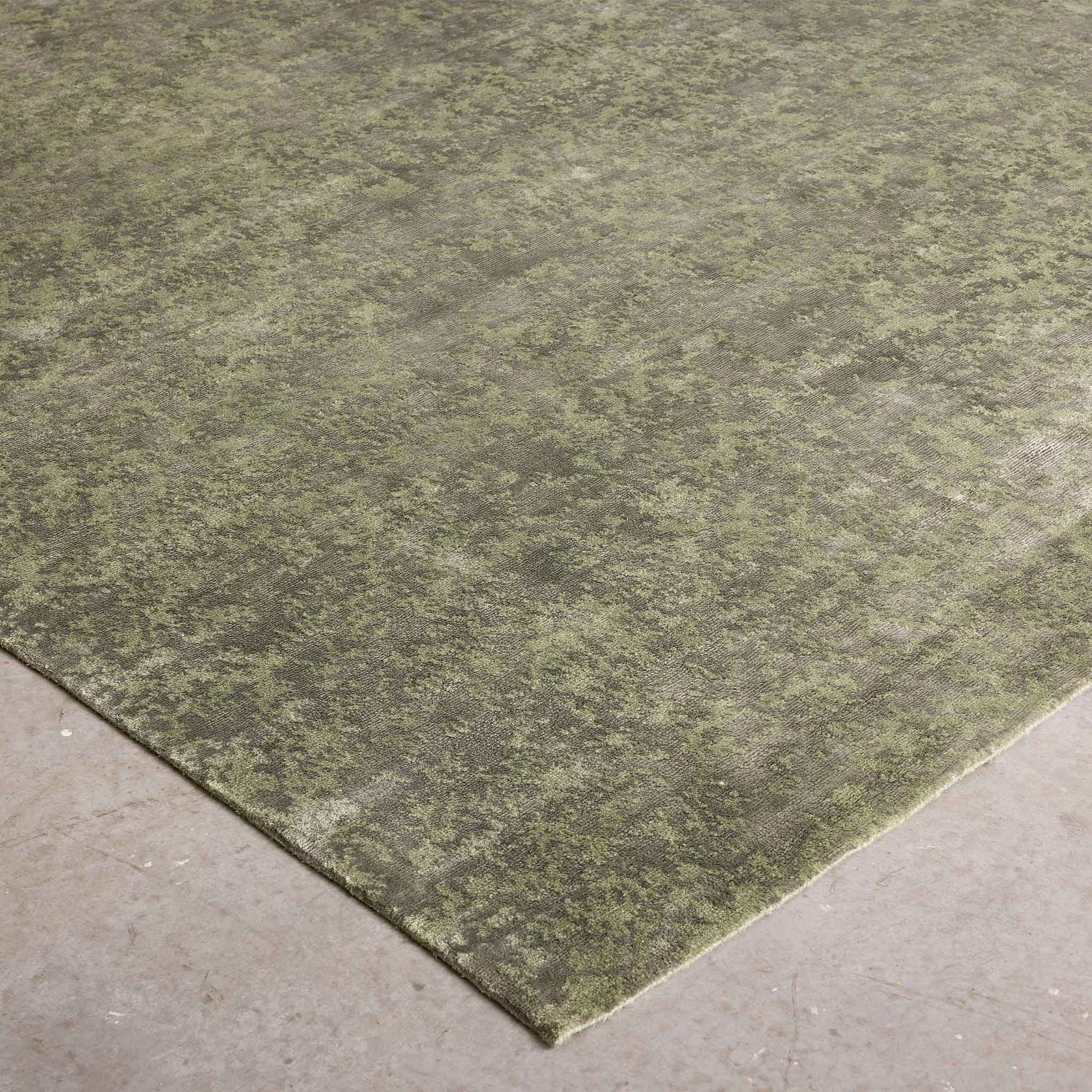 Hand knotted in nettle & artsilk, this design blends pewter and sage throughout the pattern to create a shimmering dappled design.