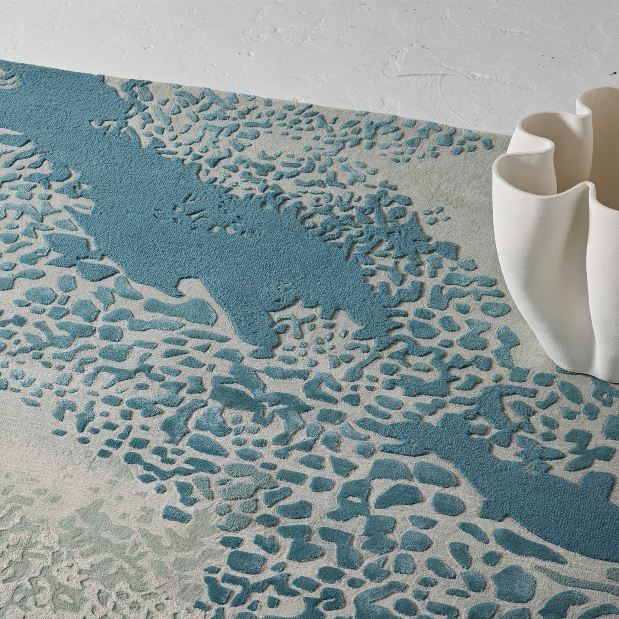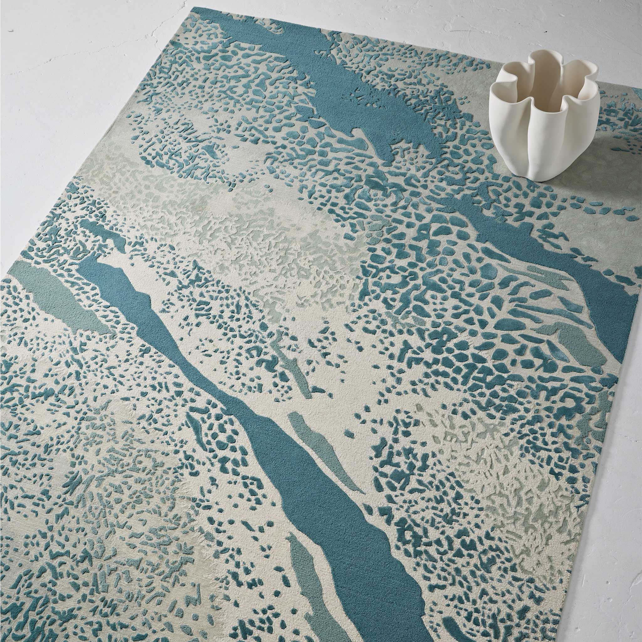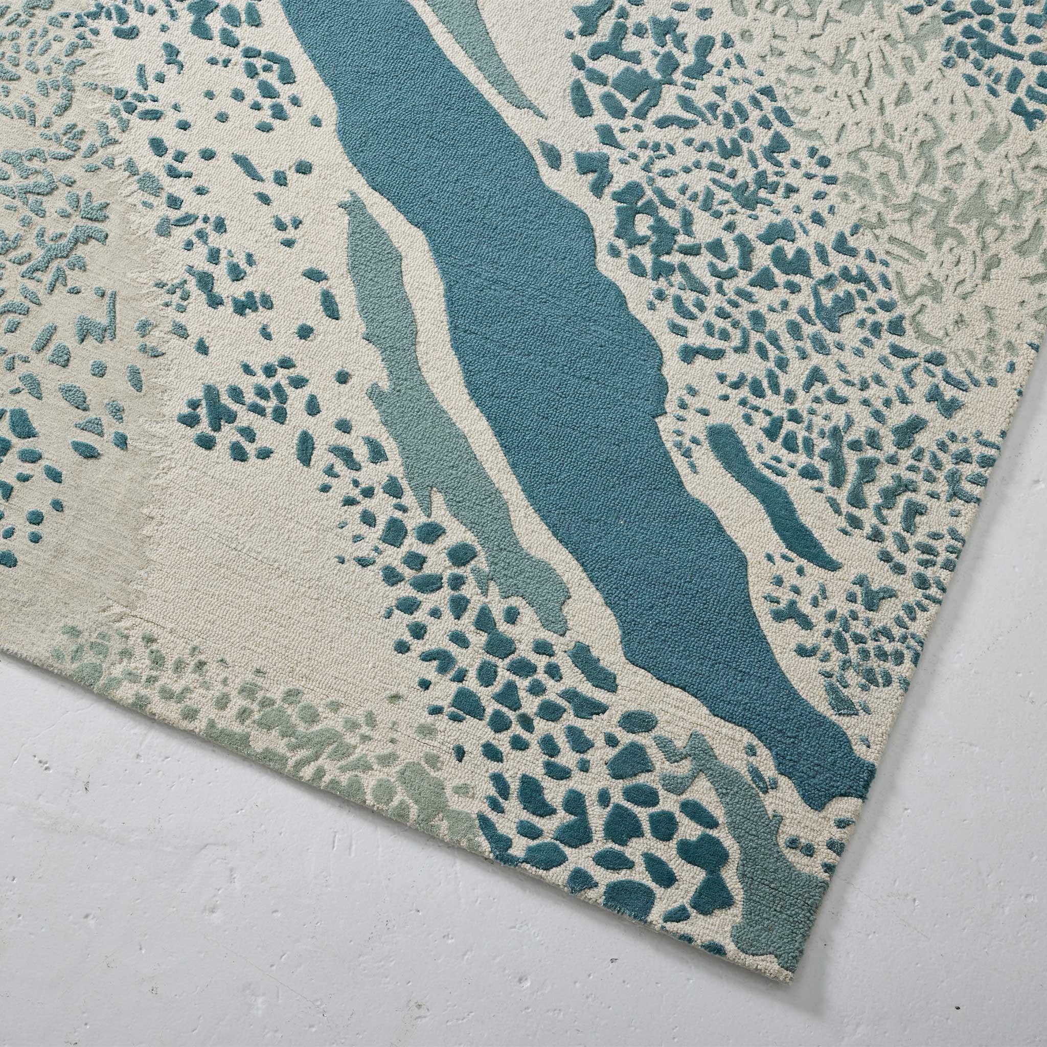 Inspired by the Great Barrier Reef in Australia, this rug features a mix of wool, felted wool and artsilk along with sections of raised piles to create dynamic movement and flow.