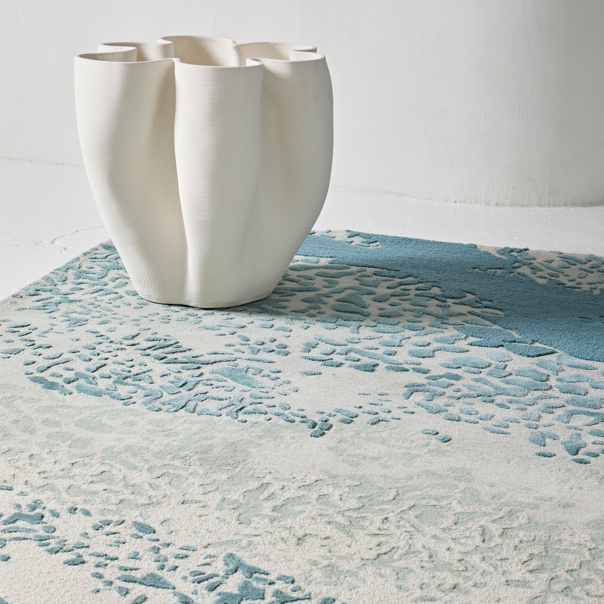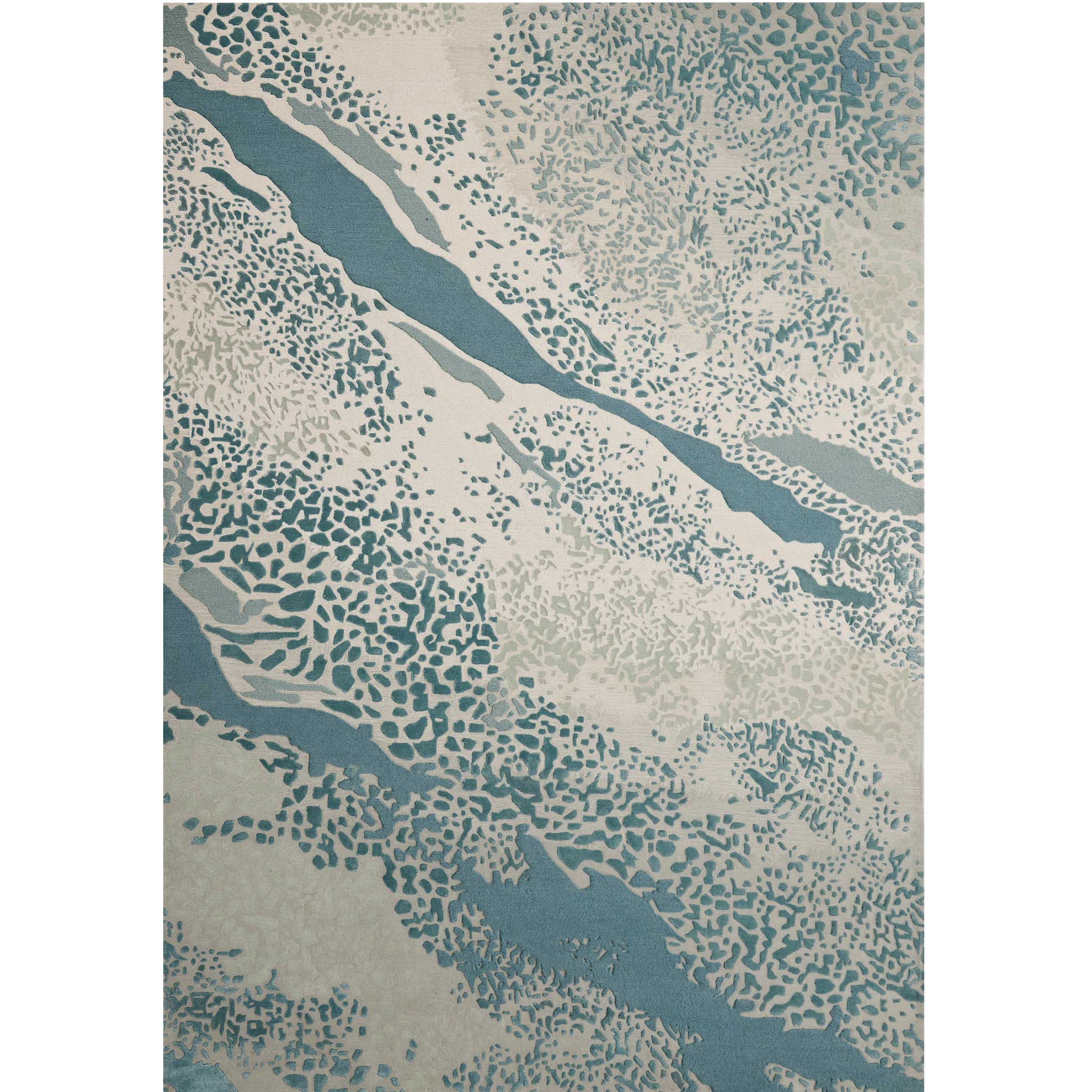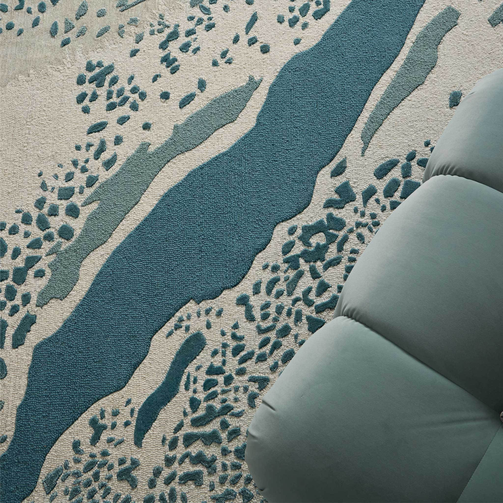 Inspired by the Great Barrier Reef in Australia, this rug features a mix of wool, felted wool and artsilk along with sections of raised piles to create dynamic movement and flow.
