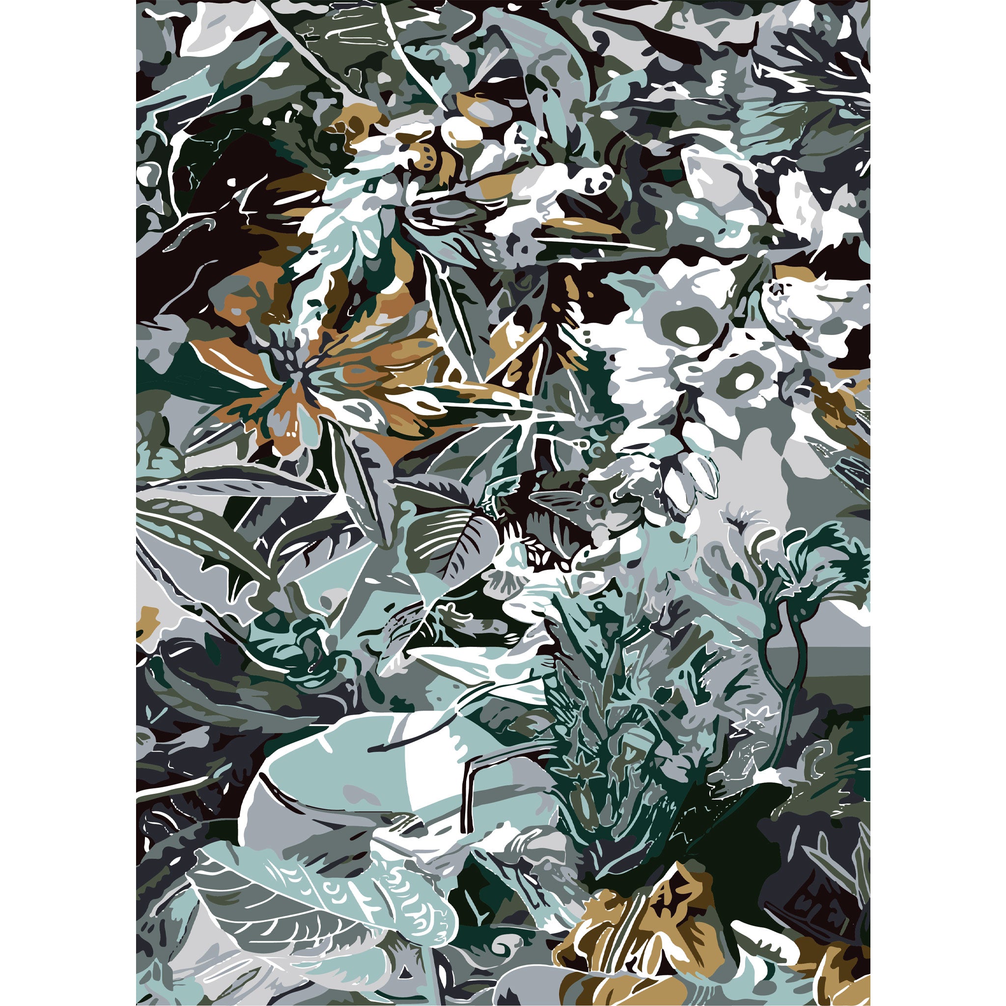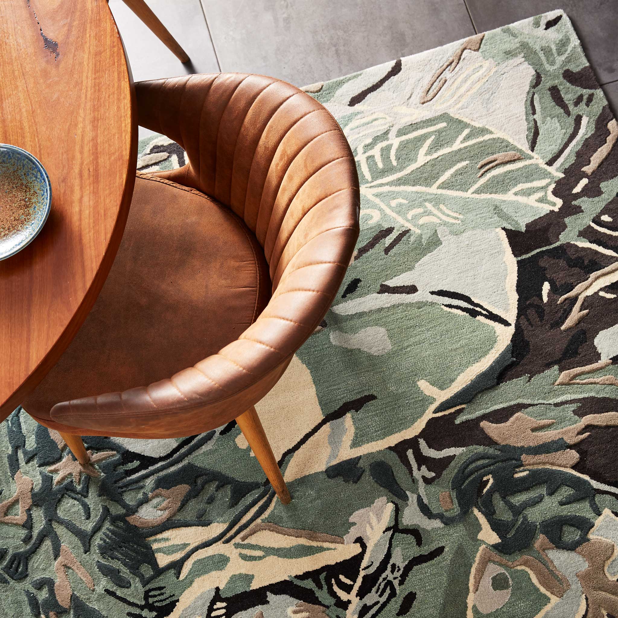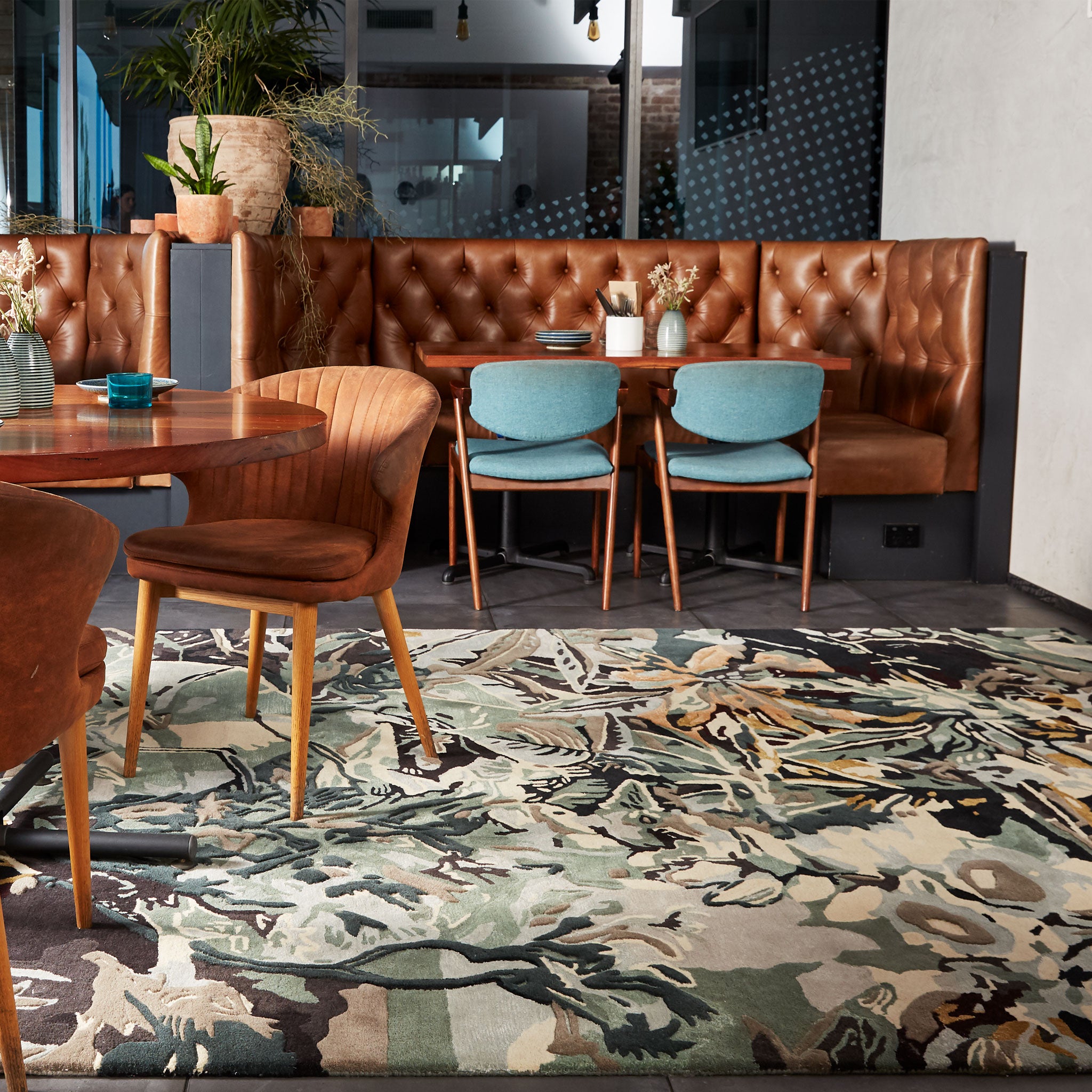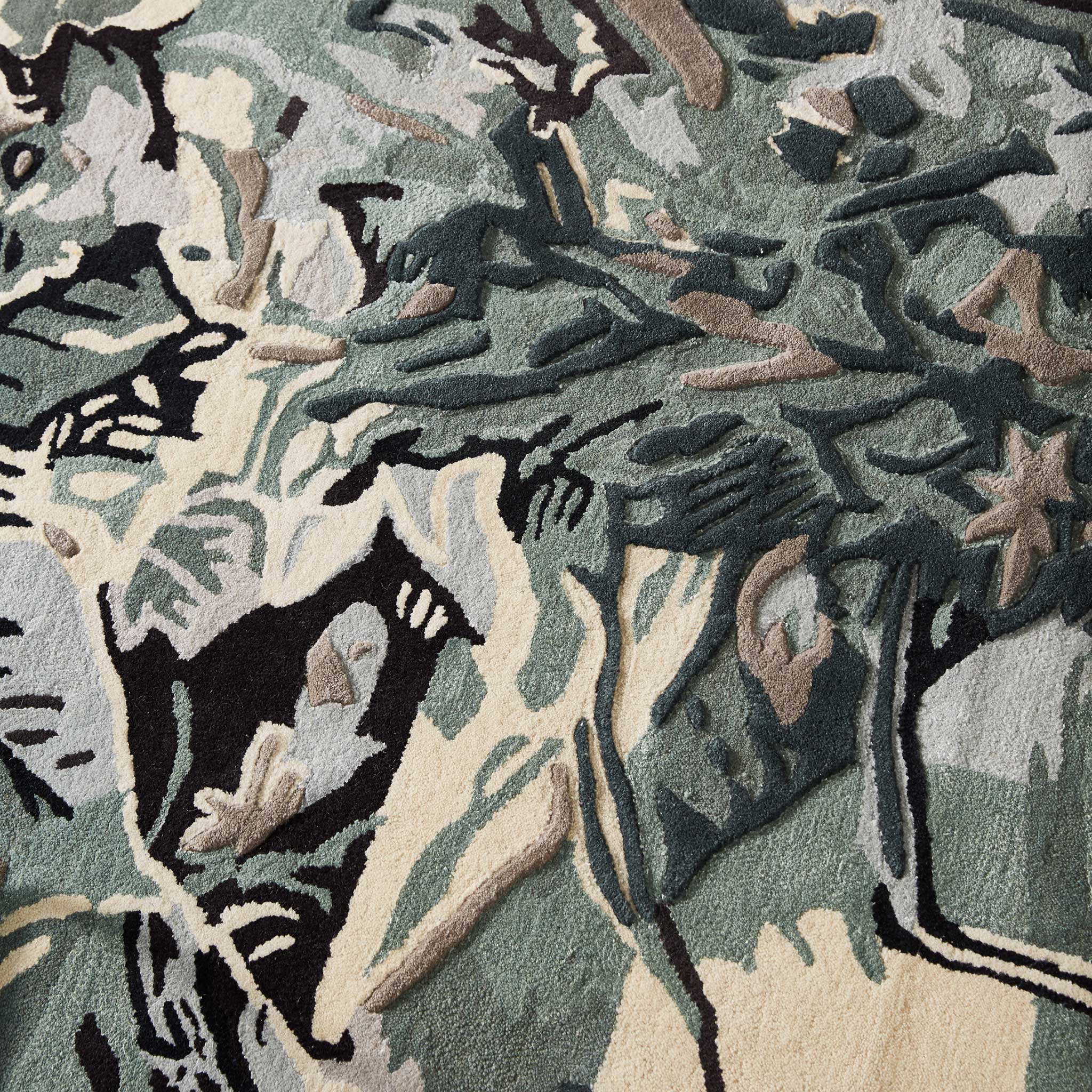 “This rug was inspired by my love of 19th Century botanical art. A passion for plants and those who drew them. Layers and layers of wild flowers, leaves and tropical plants are overlayed with peeling paint, paint splotches and spills- each layer creating a history told in pattern and colour.” – Kerrie Brown